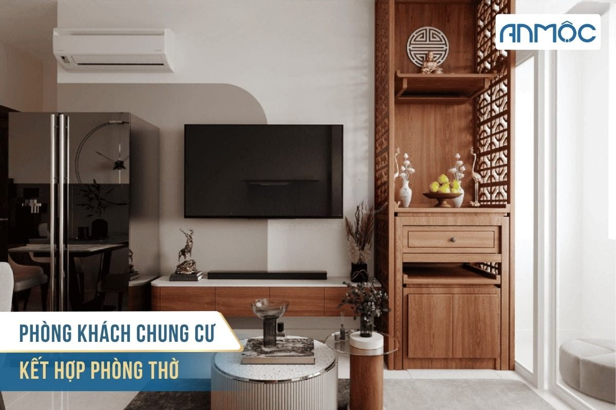 Với những căn hộ có diện tích nhỏ, việc bố trí phòng thờ trong phòng khách giúp tiết kiệm không gian mà vẫn đảm bảo yếu tố phong thuỷ. Phòng thờ thường được đặt ở vị trí trang trọng, tách biệt bằng vách ngăn hoặc sử dụng bàn thờ treo tường. Vị trí phù hợp là góc trái hoặc phải phòng khách, phía trên hoặc cạnh kệ tivi, giúp thuận tiện vệ sinh. Tránh đặt đối diện hoặc gần phòng ngủ, bếp, nhà vệ sinh.
