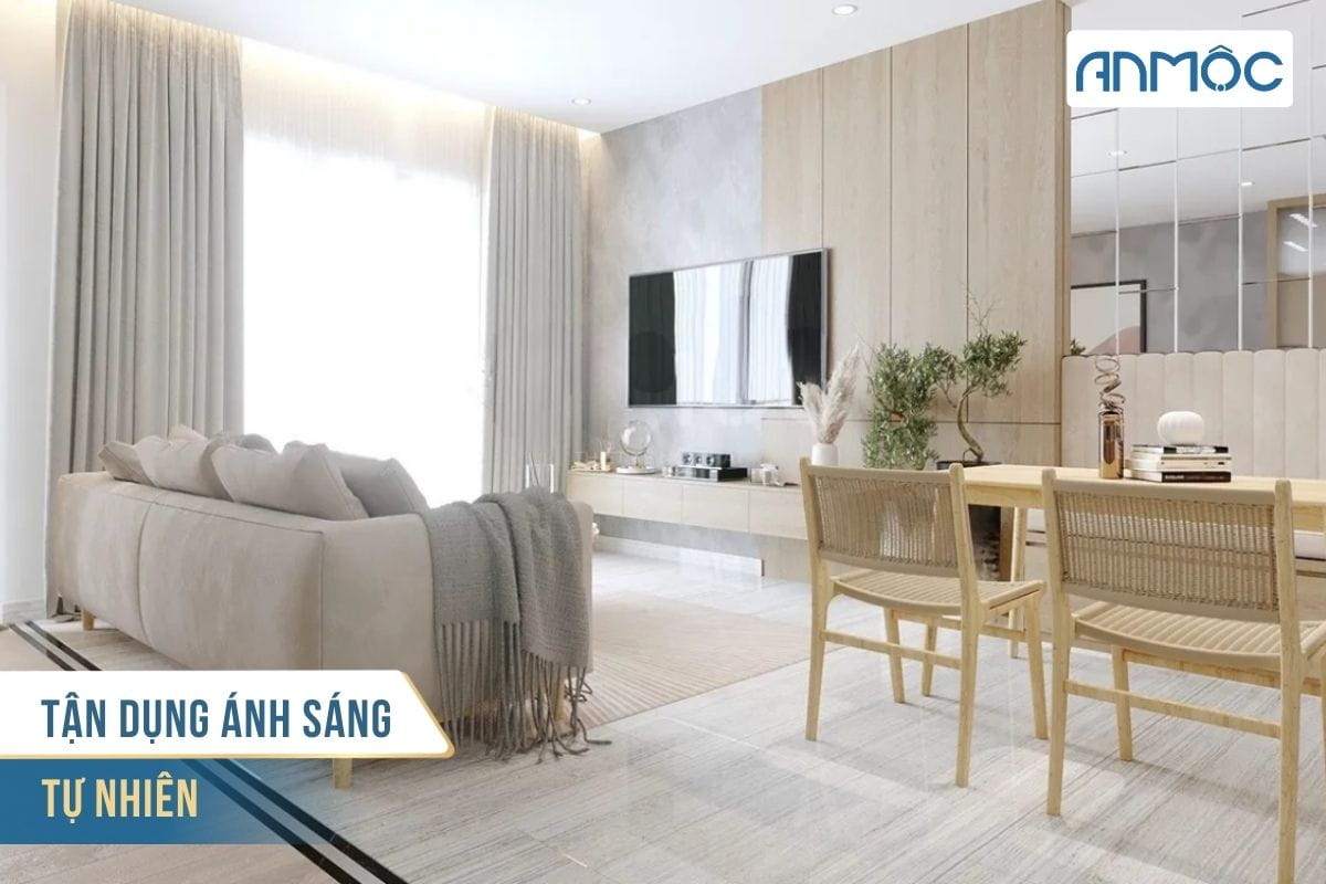 Sử dụng rèm mỏng, cửa kính lớn và sắp xếp nội thất hợp lý để ánh sáng lan tỏa tốt hơn.