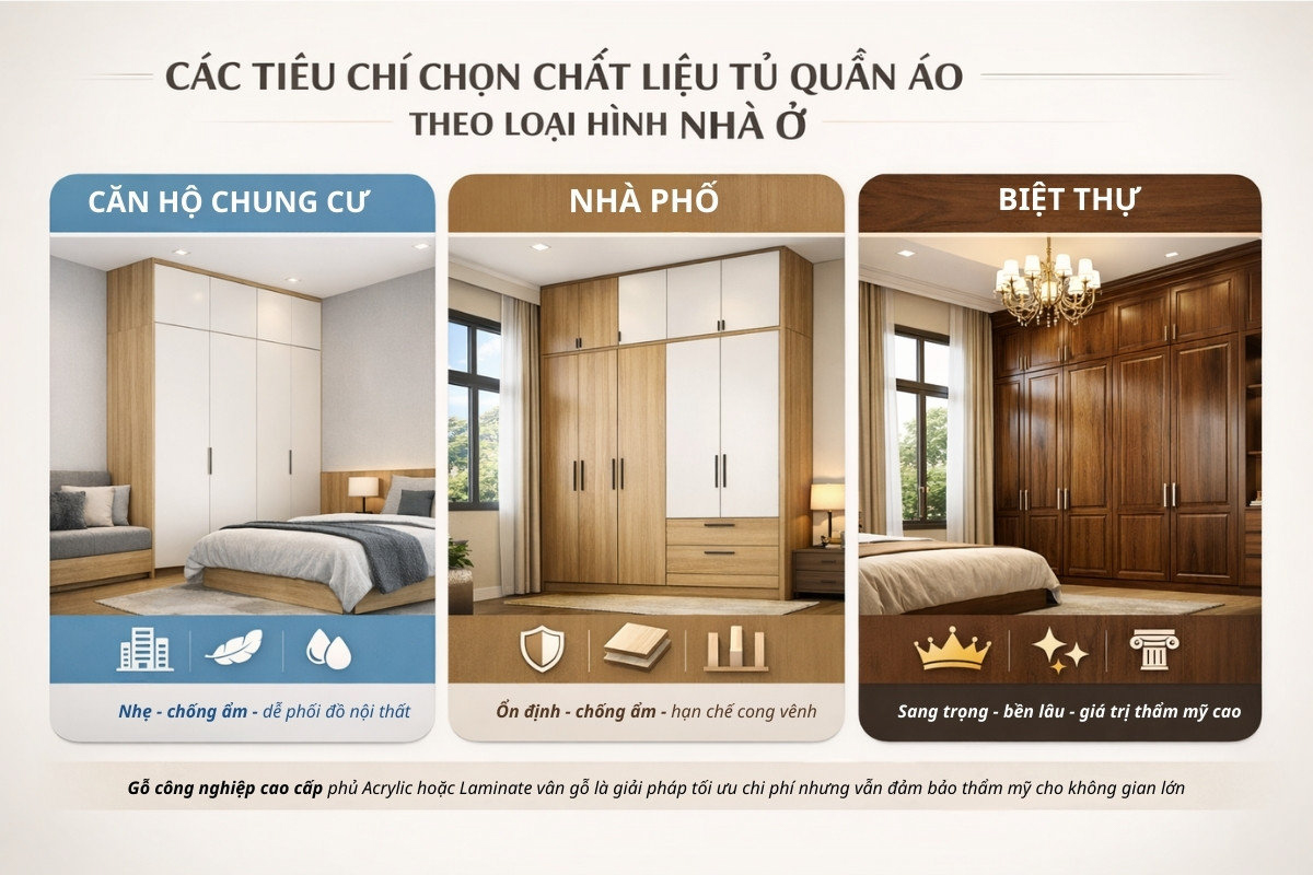 Các tiêu chí chọn chất liệu tủ quần áo theo loại hình nhà ở
