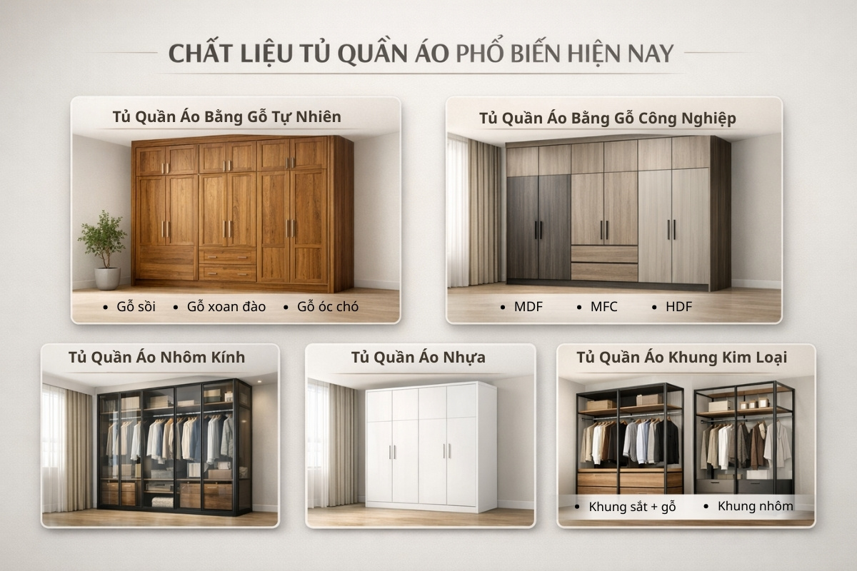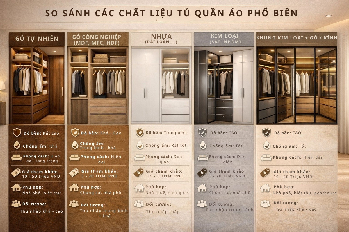 Lưu ý: Những gợi ý về chất liệu tủ quần áo trên mang tính chất tham khảo, được khảo sát dựa trên nhóm khách hàng có mức thu nhập khá. Việc lựa chọn thực tế vẫn cần cân nhắc thêm diện tích không gian, ngân sách cụ thể và nhu cầu sử dụng của từng gia đình.