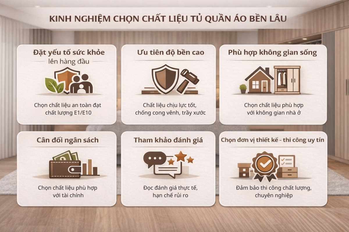 Khi chọn chất liệu tủ quần áo, bạn cần cân nhắc độ bền, thẩm mỹ và chi phí. Việc chọn đúng ngay từ đầu không chỉ giúp tránh cong vênh, trầy xước mà còn tiết kiệm chi phí. Đặc biệt, với căn hộ chung cư có độ ẩm cao và không gian kín, việc chọn chất liệu ổn định càng trở nên quan trọng.