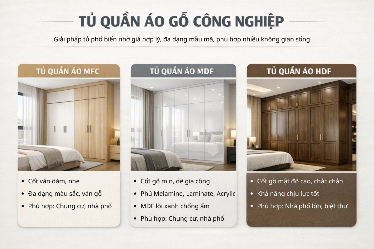 Gỗ công nghiệp là chất liệu tủ quần áo được sử dụng phổ biến nhất hiện nay nhờ giá thành hợp lý, mẫu mã đa dạng và phù hợp với nhiều không gian sống hiện đại. Các loại tủ quần áo gỗ công nghiệp thường dùng gồm: