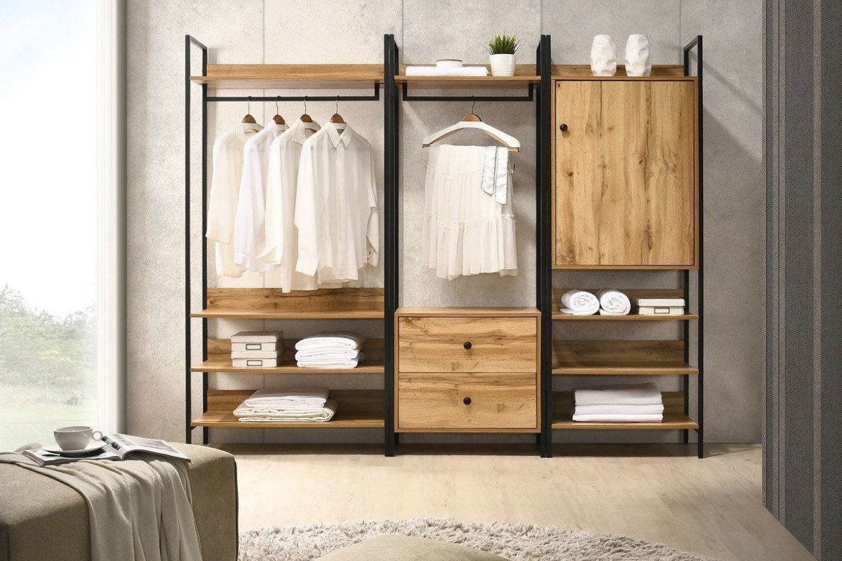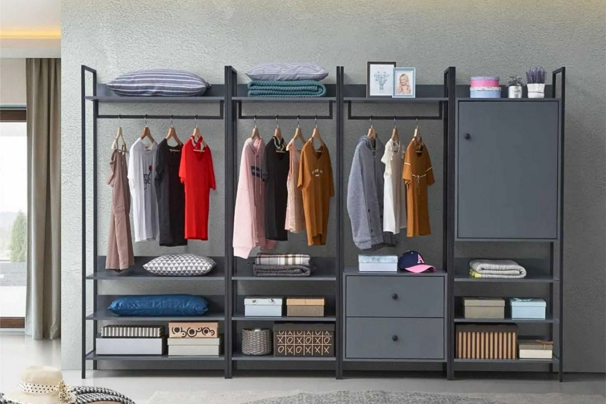 Mẫu tủ quần áo khung sắt và gỗ được bố trí nhiều ngăn treo và ngăn để đồ tiện dụng