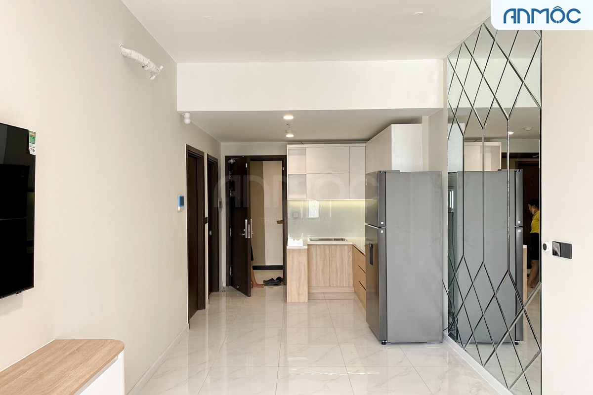 Vách gương là điểm nhấn của căn hộ, không chỉ mang ý nghĩa trang trí, vách gương còn là một “bí thuật” giúp nguồn đối lưu ánh sáng trong ngôi nhà trở nên thoáng rộng và tươi sáng hơn. Đồng thời mang lại nguồn năng lượng thoải mái và tích cực cho gia chủ. Vị trí vach gương này sẽ được đặt một bộ bàn ăn, như vậy là hoàn hảo cho một không gian bếp ăn.