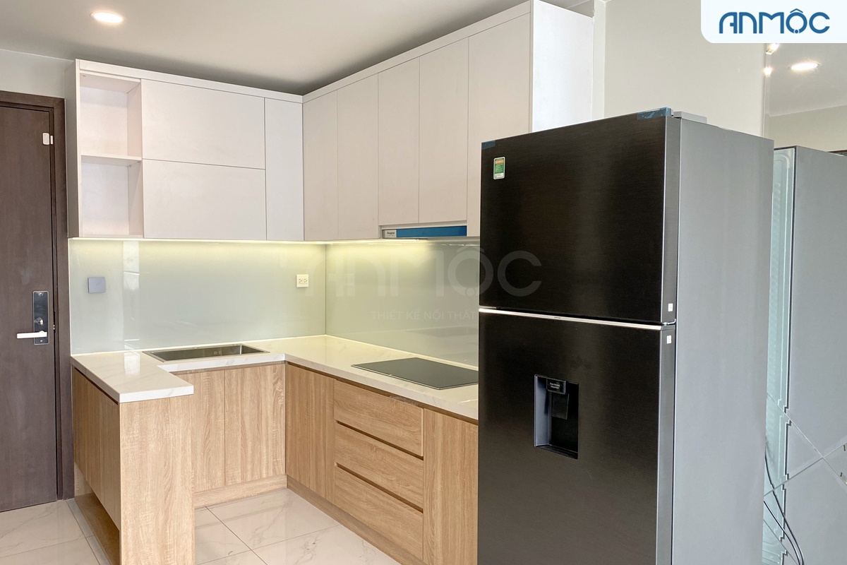 Khu vực phòng bếp bố trí nhỏ gọn và tiện nghi với các nội thất cơ bản. Tủ bếp cao kịch trần giúp nới rộng không gian lưu trữ một cách hiệu quả, giúp gia chủ sử dụng linh hoạt và tiện lợi hơn. Cách sắp xếp chữ U với một mặt bếp đặt tủ giày thông minh tạo thêm tiện ích sử dụng mà tiết kiệm diện tích và thẩm mỹ hơn.