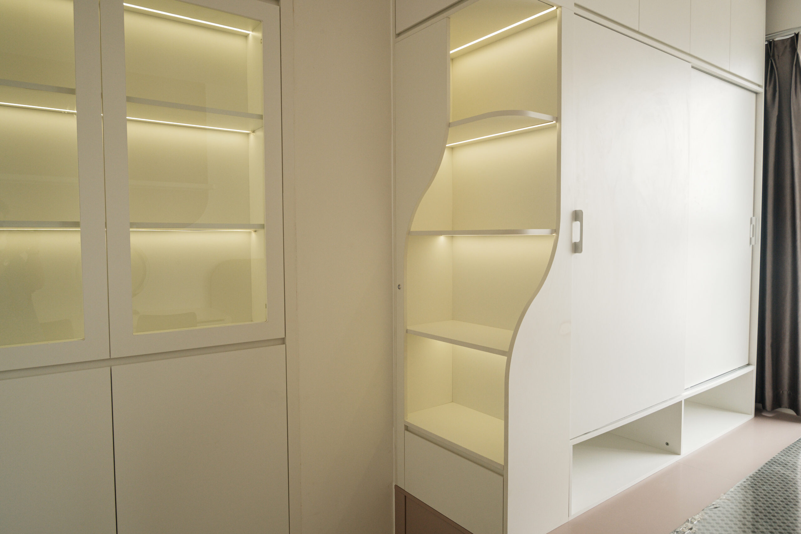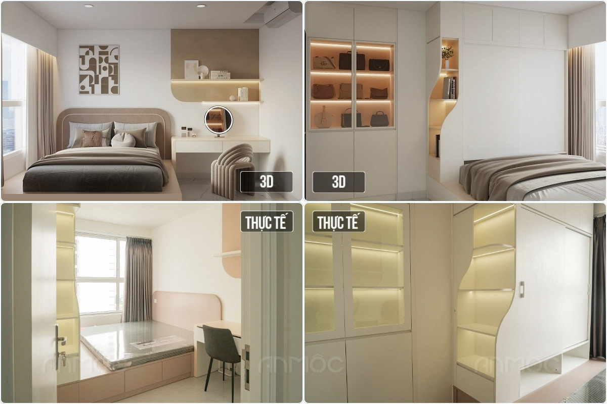 Về vật liệu, An Mộc lựa chọn gỗ MDF phủ sơn PU cho hệ tủ và giường, vừa đảm bảo độ bền màu, vừa dễ dàng vệ sinh, bảo trì. Đầu giường bo cong mềm mại kết hợp cùng vách sơn hiệu ứng tạo nên điểm nhấn nhẹ nhàng, giúp căn phòng thêm tinh tế mà không gây rối mắt.