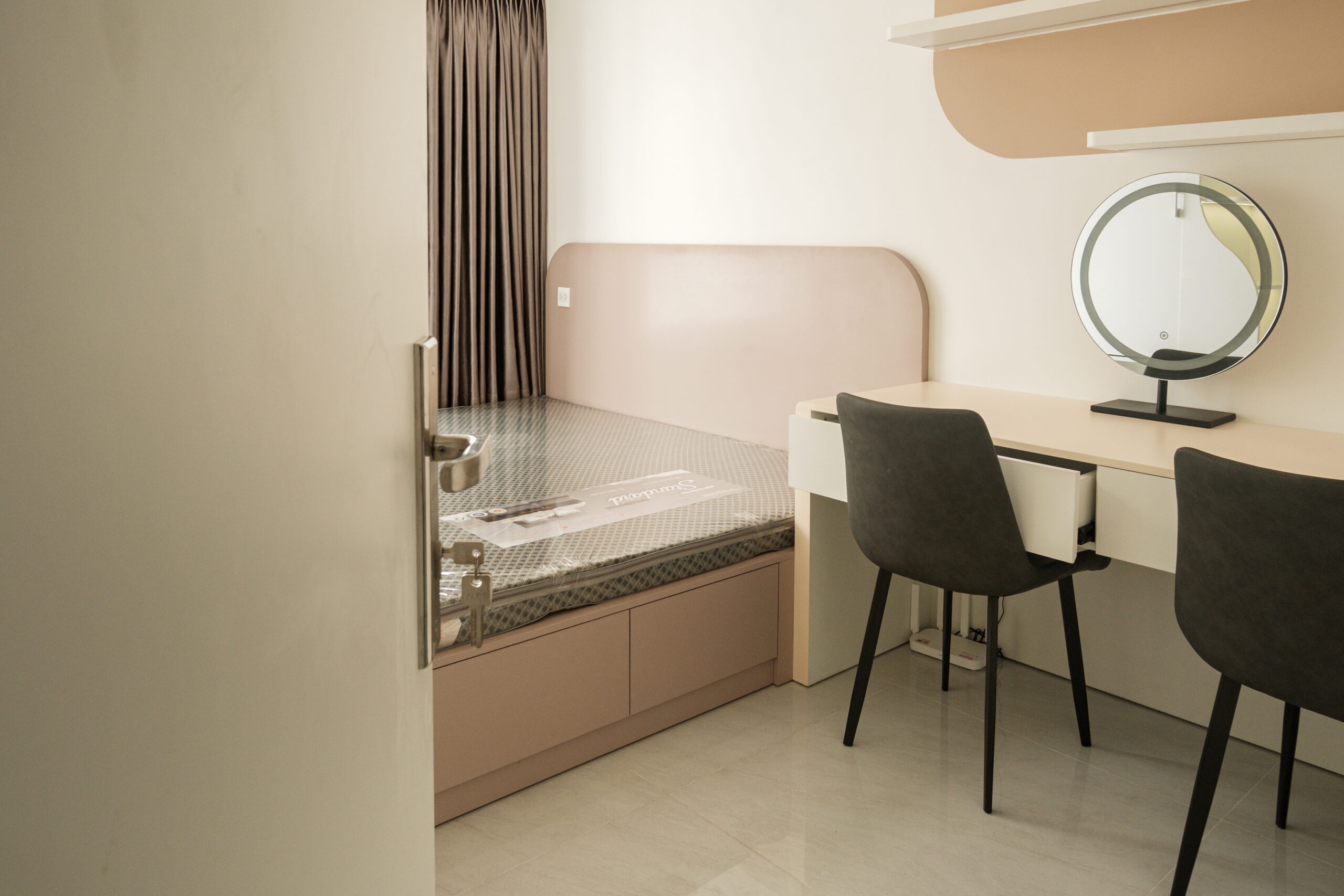 Phòng ngủ được thiết kế với bảng màu pastel nhẹ nhàng, kết hợp hài hòa giữa trắng, hồng nude và xám ghi, mang đến cảm giác thư giãn và ấm cúng. Sự phối hợp tinh tế giữa các gam màu giúp không gian trở nên hài hòa, nữ tính nhưng vẫn hiện đại, đồng thời đồng điệu với phong cách tối giản của toàn căn hộ.