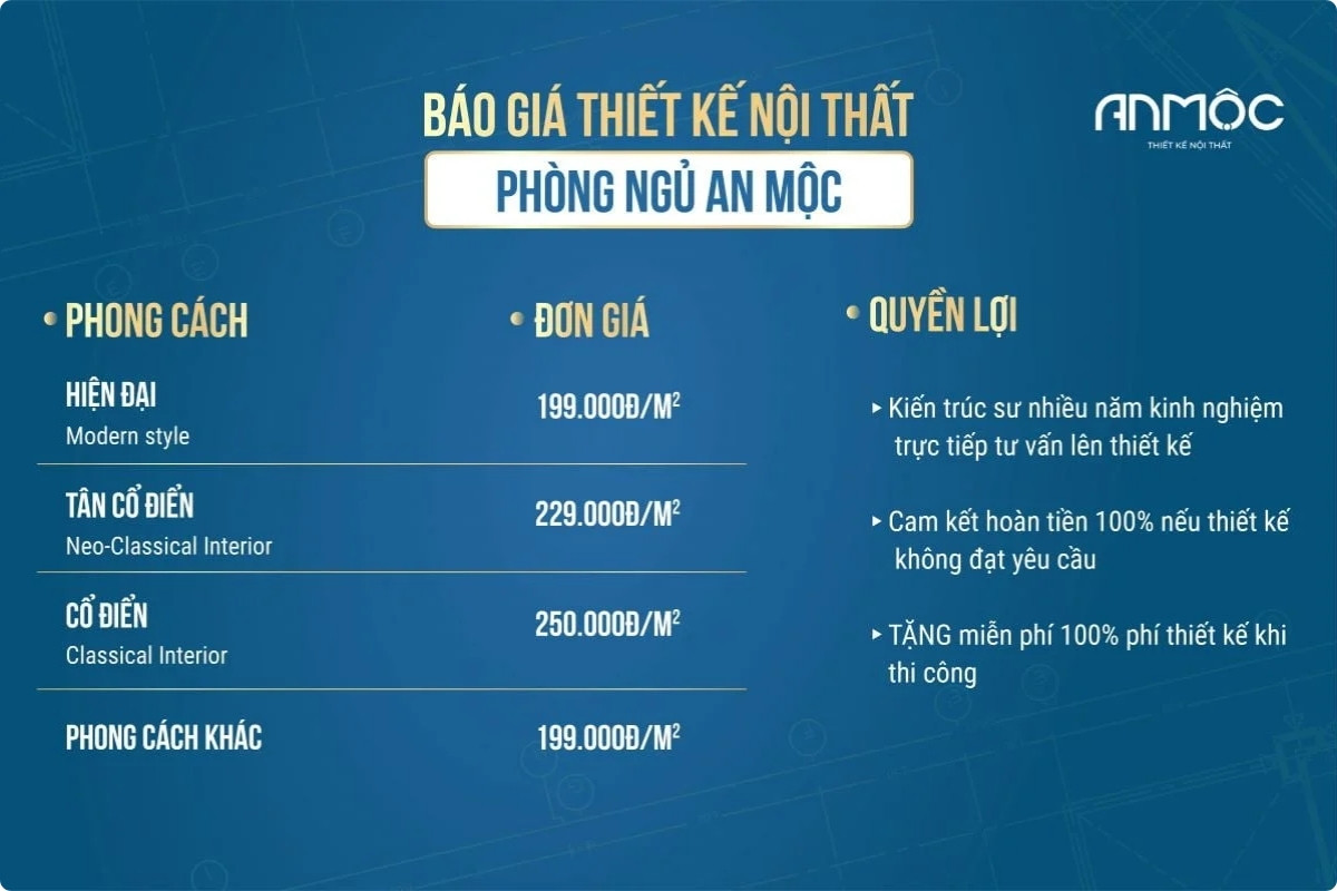 Tham khảo ngay bảng báo giá thiết kế phòng ngủ An Mộc để dễ dàng lên kế hoạch thiết kế không gian phù hợp: