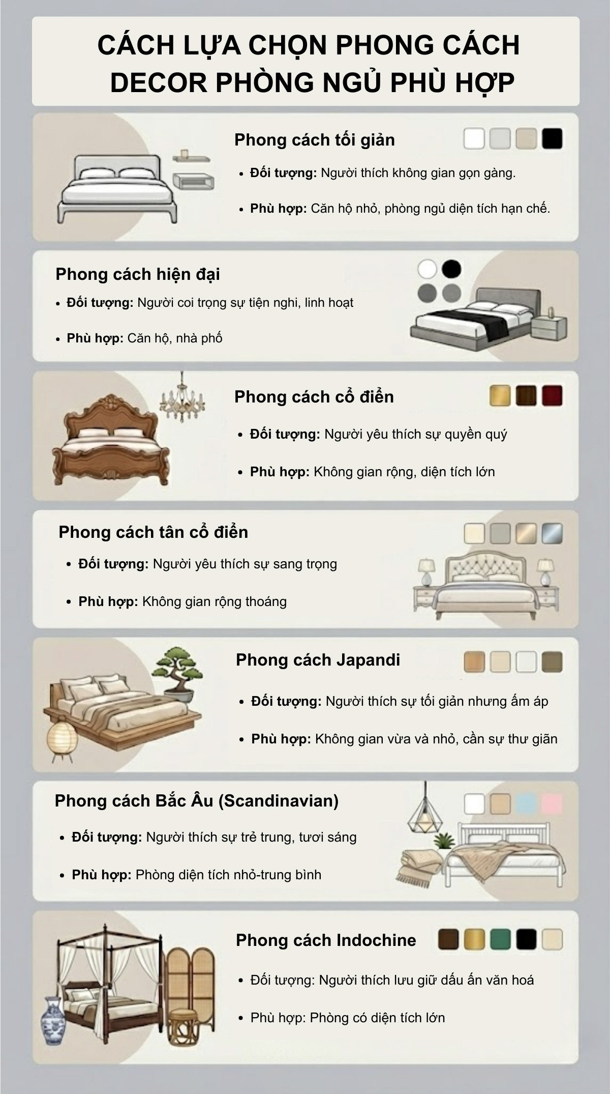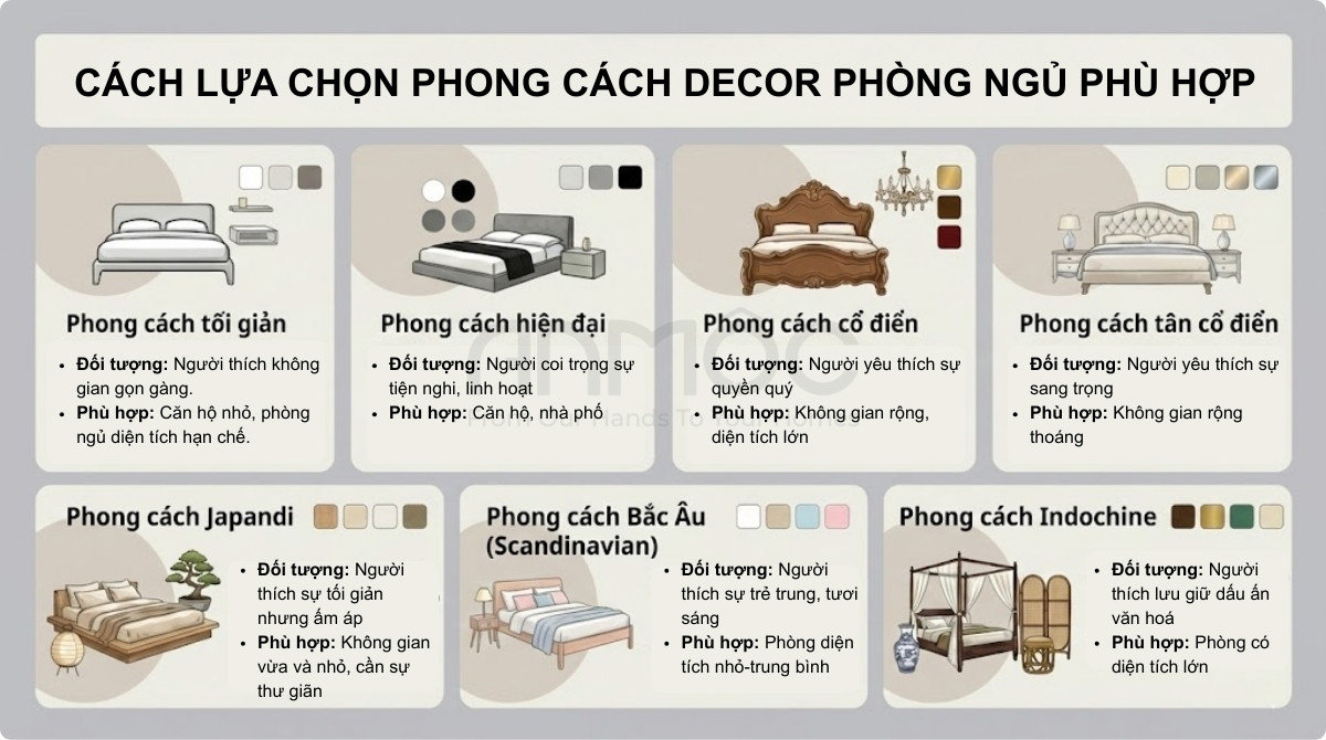 Việc lựa chọn đúng phong cách decor sẽ giúp phòng ngủ trở nên hài hòa và phản ánh đúng cá tính của bạn. Dưới đây là những phong cách phổ biến mà bạn có thể tham khảo!