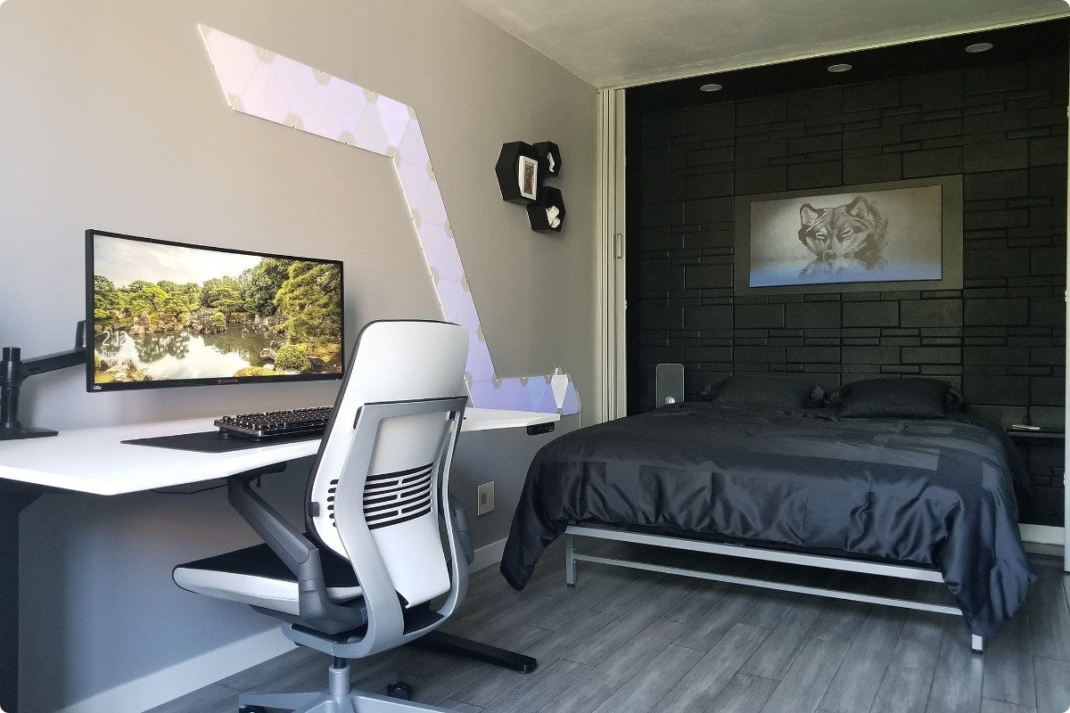 Phòng gaming hướng đến sự cá tính và tiện nghi với giường ngăn kéo, bàn máy tính và ánh sáng LED tạo điểm nhấn ấn tượng. Kết hợp ghế công thái học và rèm tối màu giúp tăng sự thoải mái và giữ trọn không gian riêng tư khi giải trí.