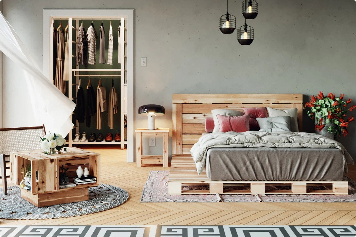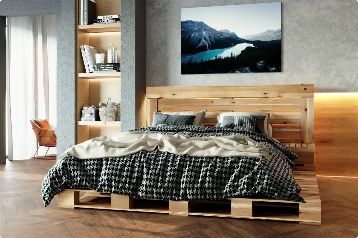 Decor phòng ngủ với pallet mang đến cảm giác mộc mạc và gần gũi. Việc tận dụng các tấm gỗ pallet cho giường, kệ hoặc trang trí tường, kết hợp cùng ánh sáng dịu và vài chi tiết như tranh canvas hay thảm họa tiết, sẽ giúp không gian nhỏ trở nên sáng tạo và ấn tượng hơn.