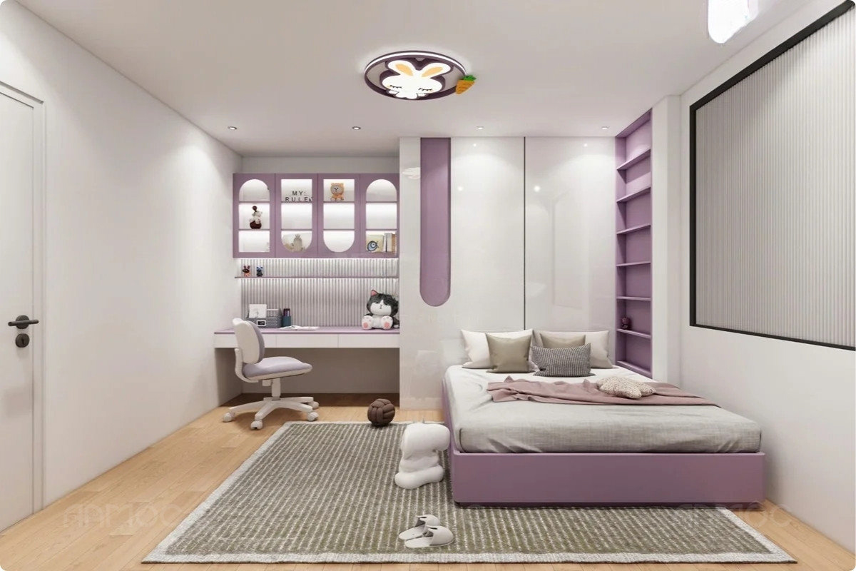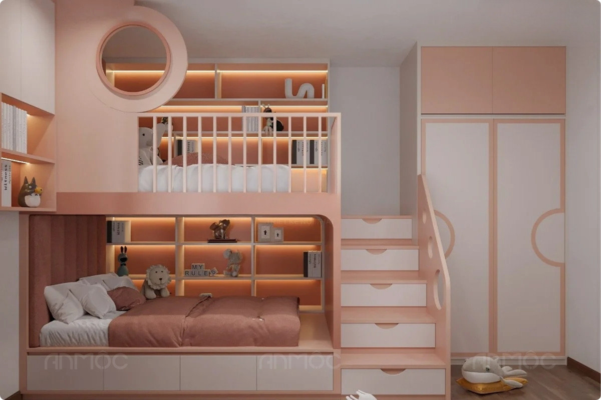 Không gian dành cho bé gái hướng tới sự dễ thương và ấm áp, thường sử dụng gam màu pastel như hồng, kem để tạo cảm giác dịu ngọt. Nội thất gồm giường nhỏ, tủ đựng đồ gọn và bàn học phù hợp độ tuổi sẽ tạo cho bé cảm thấy an toàn và thoải mái.