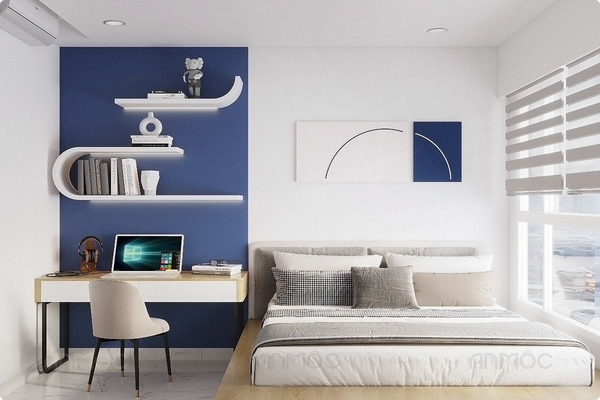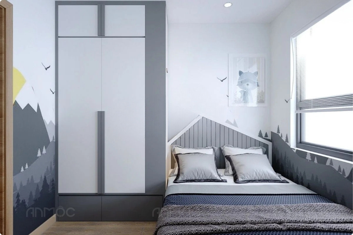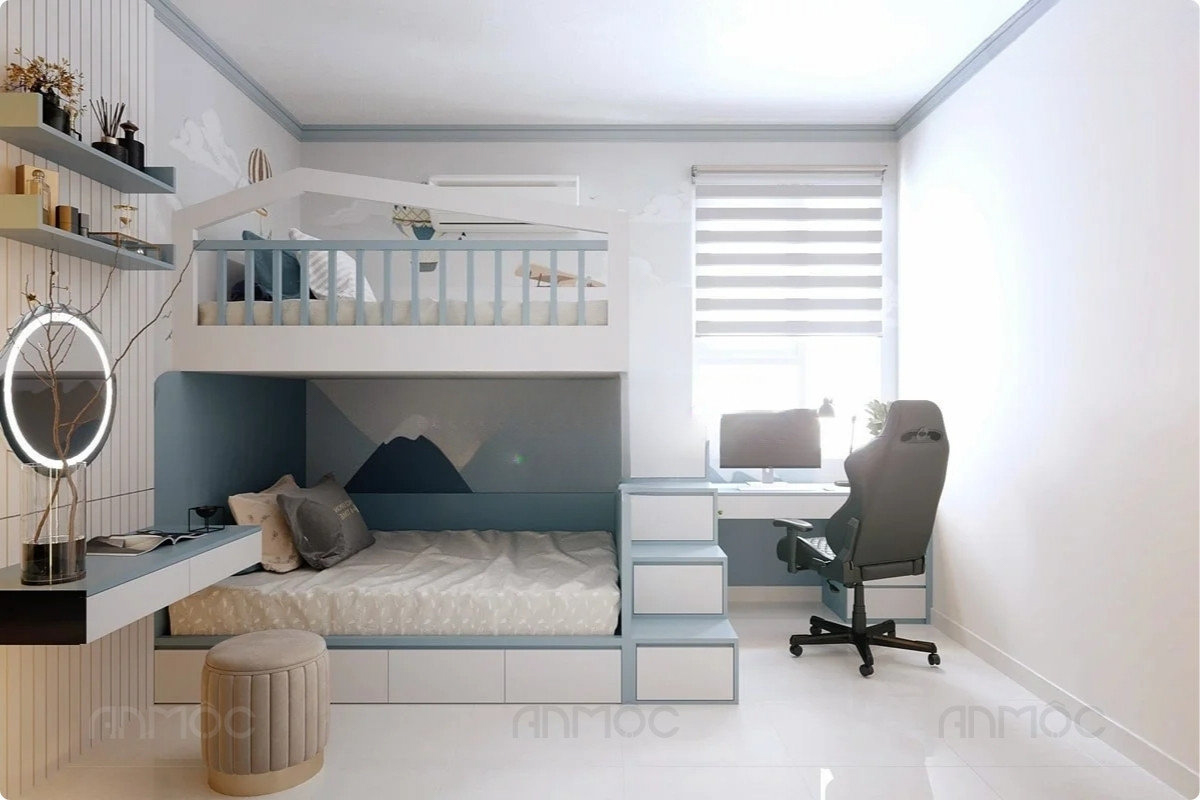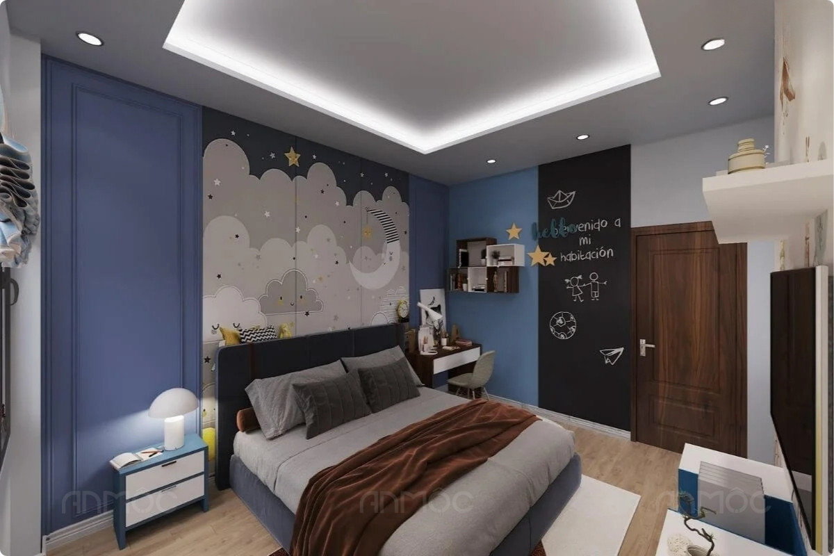 Phòng bé trai thường được thiết kế với tông xanh dương, xám, xanh lá nhằm tạo cảm giác mạnh mẽ, tươi mới và kích thích sự khám phá. Nội thất phù hợp gồm giường đơn hoặc giường tầng, tủ đồ gọn và bàn học tích hợp đa năng để tăng sự thú vị và giúp bé dễ dàng sáng tạo.