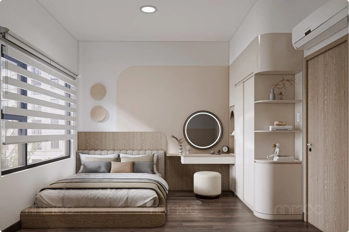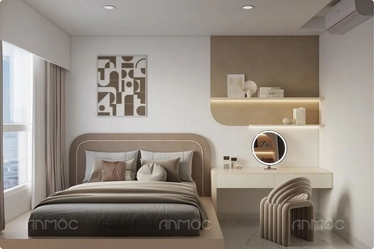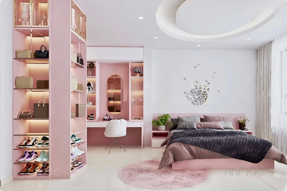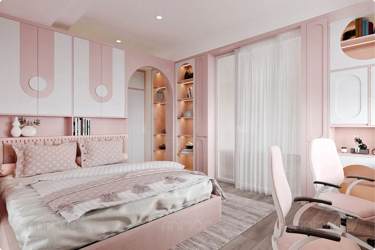 Phòng ngủ nữ thường dùng gam màu nhẹ nhàng như hồng phấn, trắng hay pastel, tạo cảm giác dịu dàng, thư giãn. Nội thất nhỏ gọn, tiện ích như giường hộc kéo, bàn trang điểm mini hay tủ quần áo giúp tối ưu không gian.
