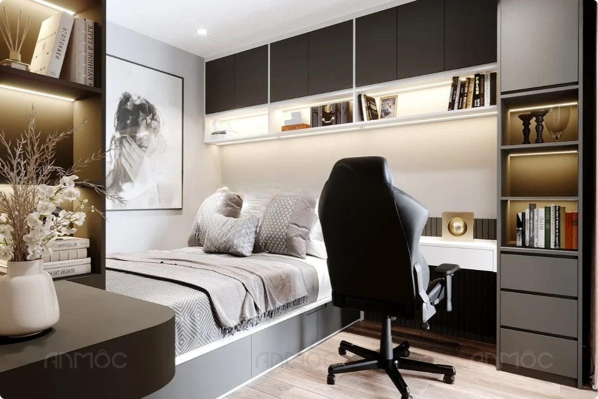 Phòng ngủ phong cách nam thường dùng các gam màu mạnh như xám, xanh đậm hoặc đen. Nội thất tối giản nhưng tinh tế – giường dáng thẳng, bàn làm việc hiện đại và tủ âm tường – giúp không gian trông gọn gàng và thoáng hơn.