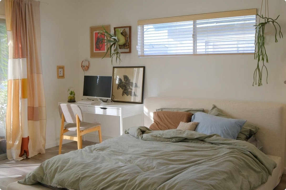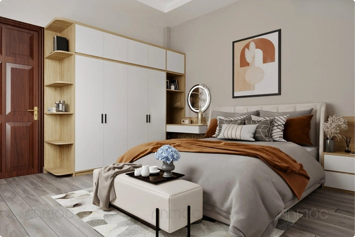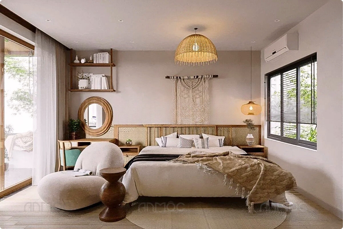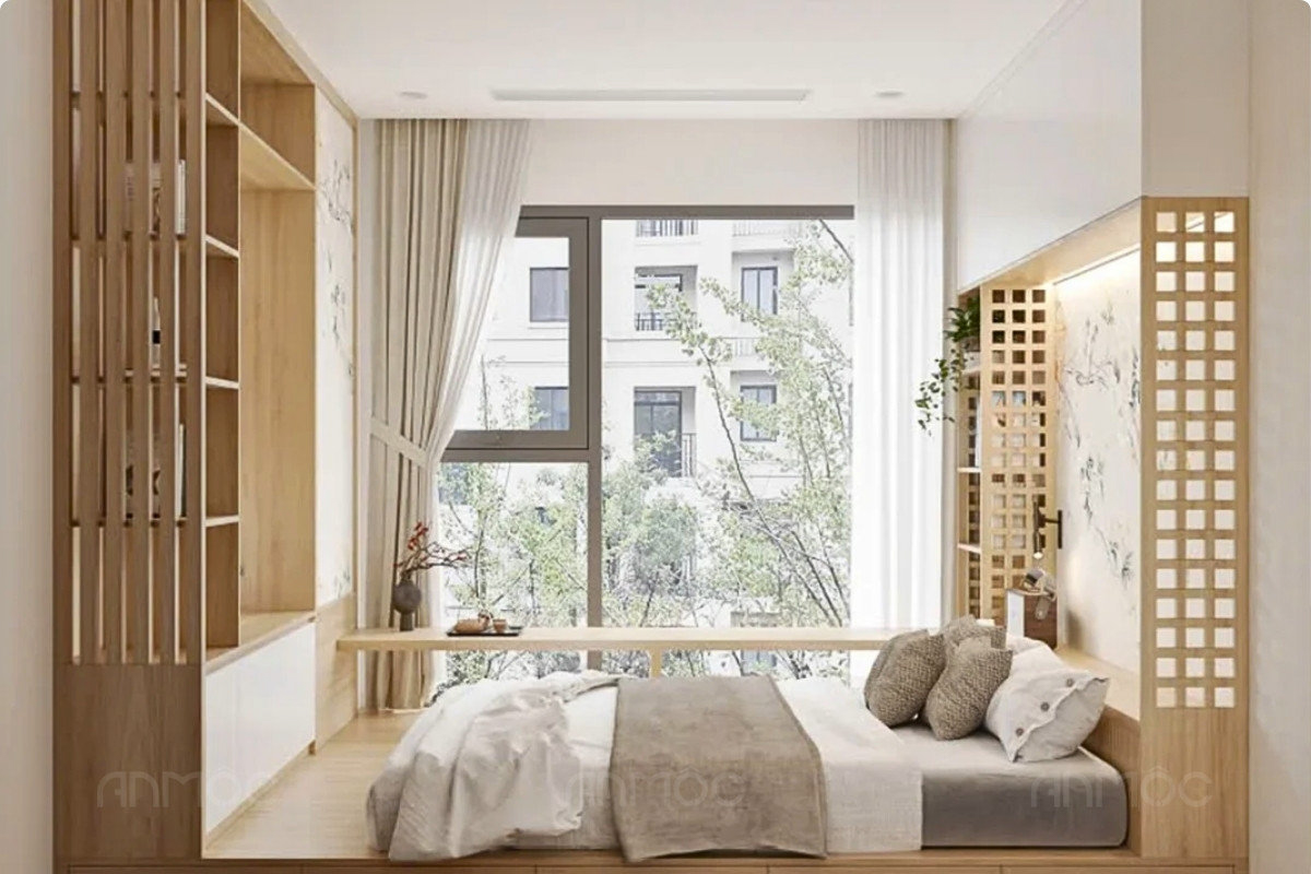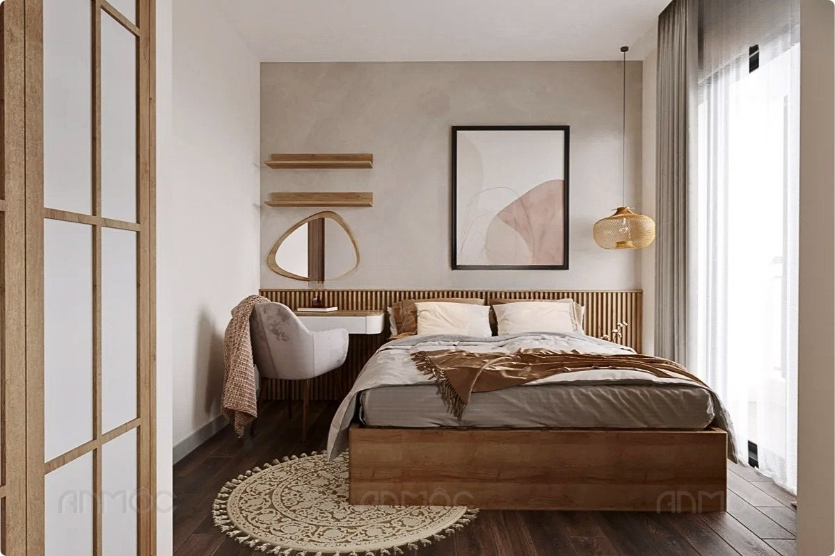 Phong cách Japandi là sự kết hợp tinh tế của Nhật Bản và nét nét ấm áp của Scandinavian, mang đến phòng ngủ vừa thanh lịch vừa gần gũi. Phòng thường sử dụng tông màu trung tính như be, trắng, nâu nhạt, cùng chất liệu gỗ và vải tự nhiên.