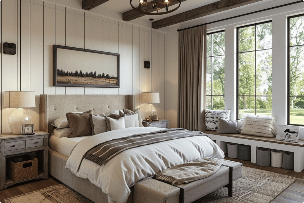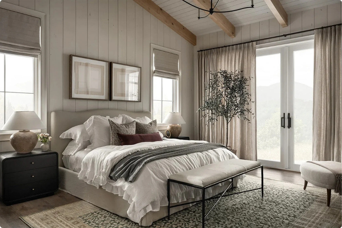 Phòng ngủ phong cách Farmhouse mang đến cảm giác gần gũi, mộc mạc không kém phần tinh tế và ấm cúng. Không gian thường sử dụng gam màu trung tính như trắng, be, nâu gỗ kết hợp cùng nội thất từ gỗ tự nhiên, vải thô và những chi tiết vintage nhẹ nhàng.
