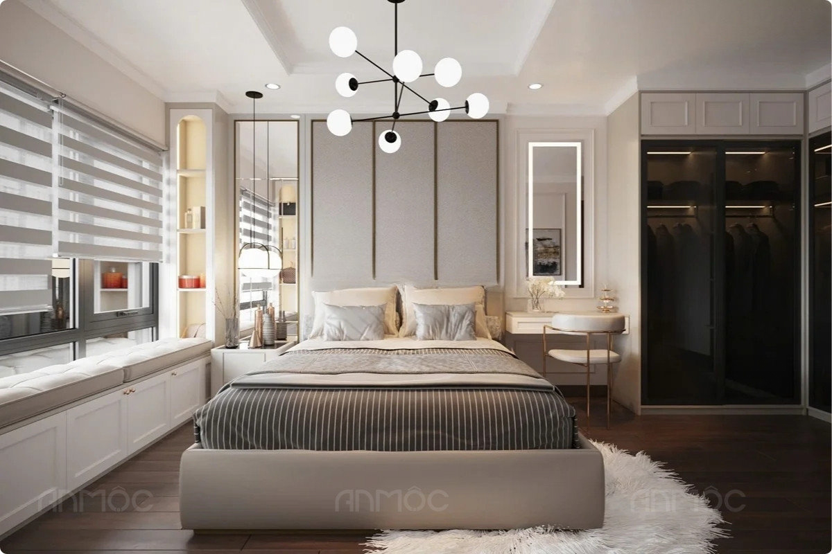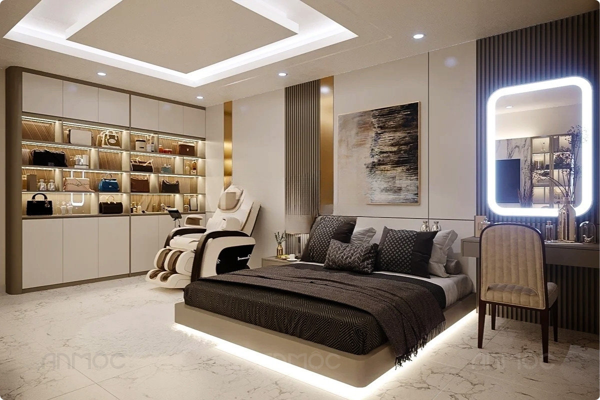 Với không gian này rộng hơn nên cần được phân chia khu chức năng rõ ràng. Ngoài nội thất cơ bản có thể thêm bàn trang điểm, tủ âm tường để tăng tiện nghi.