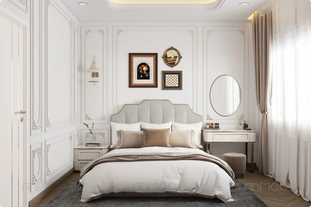 Không gian phòng ngủ vợ chồng thường hướng đến sự thư giãn và gắn kết vì đây là nơi nghỉ ngơi và nuôi dưỡng tình cảm. Ưu tiên sử dụng tông màu trắng, be hoặc xám làm nền, điểm nhẹ xanh pastel/hồng nhạt giúp tạo cảm giác hài hòa, dịu mắt cho phòng ngủ.