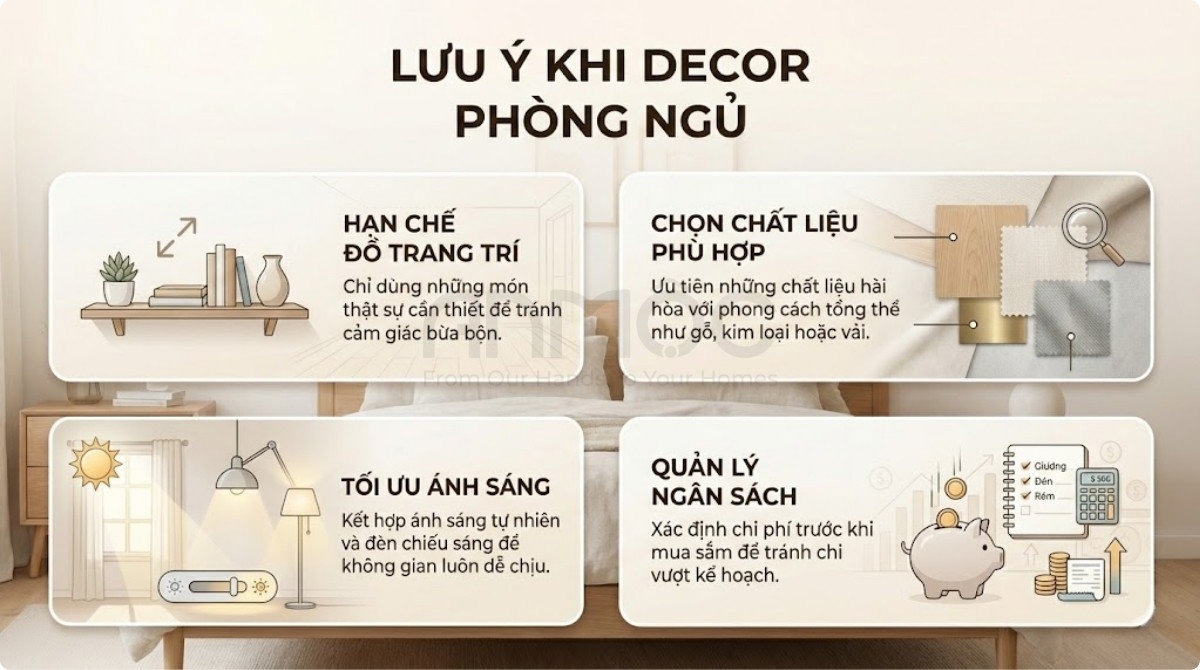 Những lưu ý khi decor phòng ngủ dưới đây sẽ giúp bạn tạo nên không gian nghỉ ngơi hài hòa, dễ chịu và phù hợp với nhu cầu sử dụng: