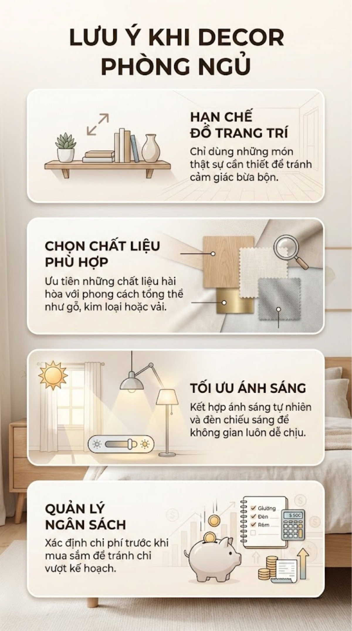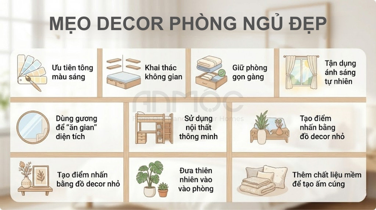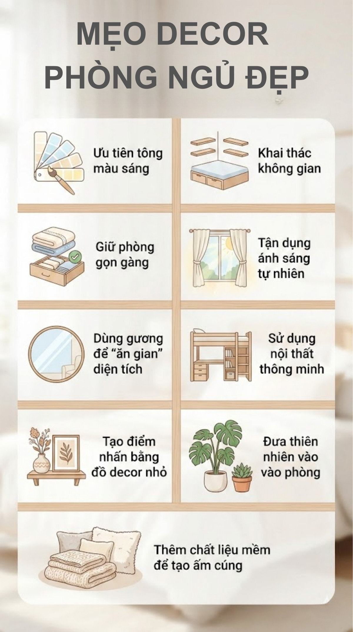 Để decor phòng ngủ đẹp và tiết kiệm, bạn cần chọn đúng phong cách, kết hợp bố trí thông minh và những lưu ý quan trọng. Dưới đây là các bí quyết giúp tạo nên không gian thư giãn trọn vẹn: