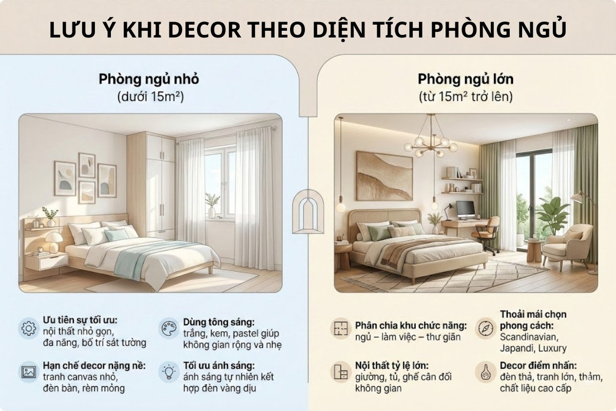 Mỗi diện tích phòng ngủ đều có cách decor phù hợp riêng, nắm rõ những lưu ý quan trọng này sẽ giúp không gian luôn hài hòa, tiện nghi và đẹp mắt: