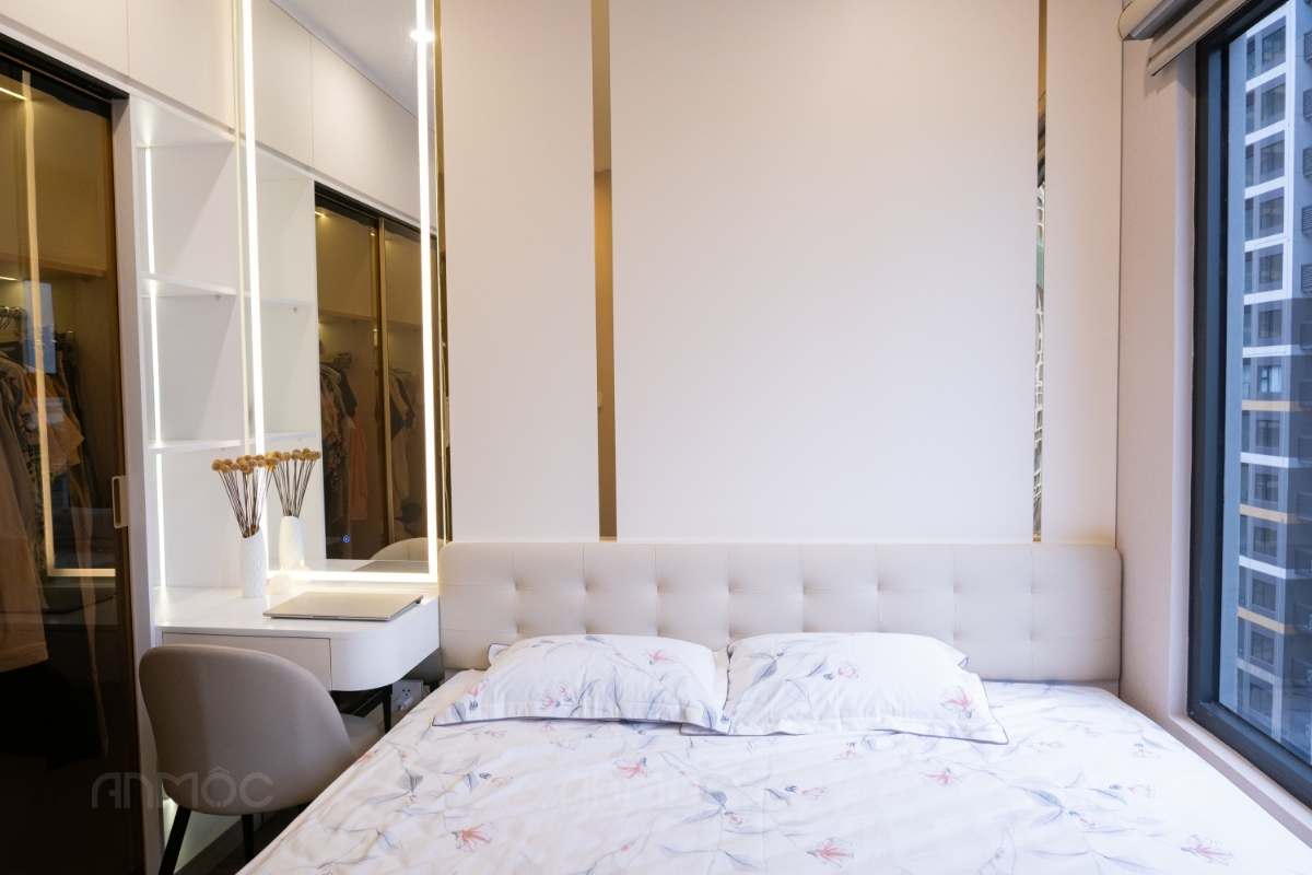 Hệ tủ quần áo cánh kính khung nhôm kết hợp đèn led viền mang đến vẻ sang trọng và hiện đại, trong khi bàn trang điểm nhỏ gọn được bố trí cạnh giường giúp tối ưu diện tích mà vẫn tiện nghi. Cửa sổ lớn đón trọn ánh sáng ban mai, mang lại nguồn năng lượng tích cực mỗi ngày cho gia chủ.