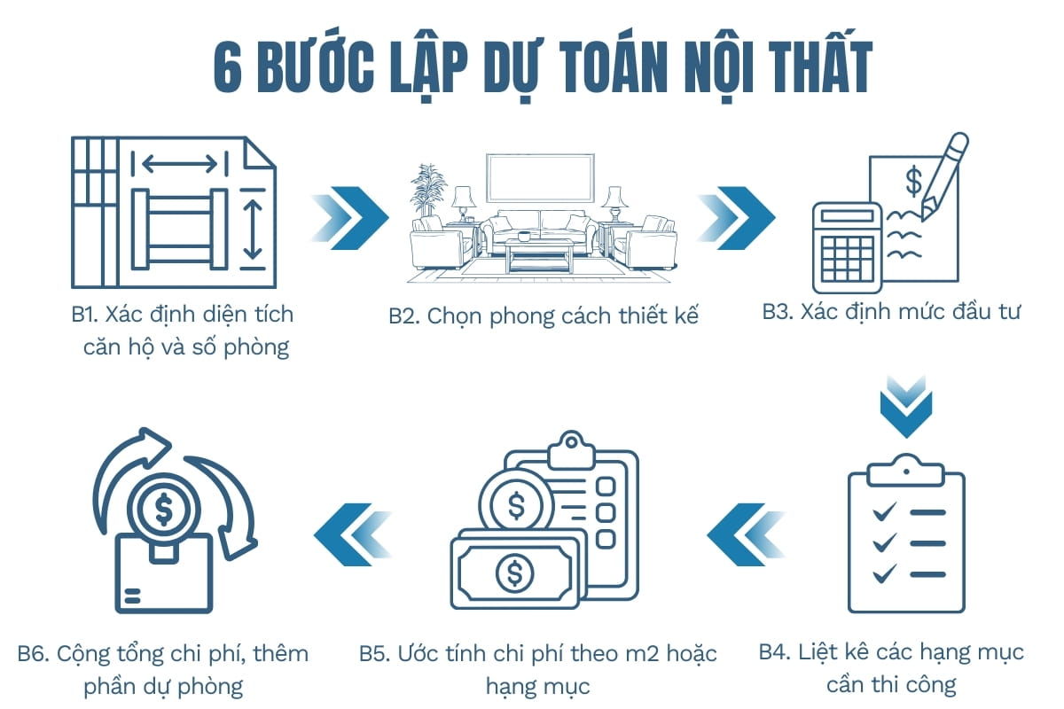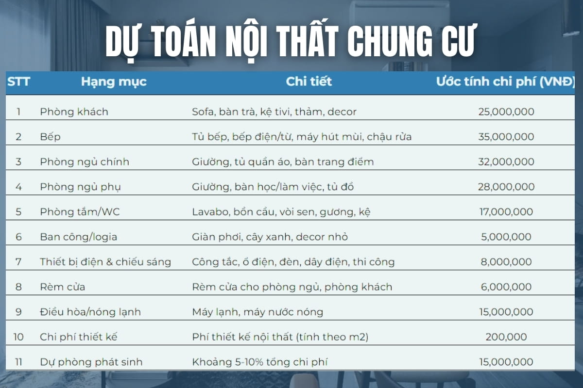 Đừng lo! Bài viết này sẽ cung cấp cho bạn cái nhìn rõ ràng và chi tiết về các hạng mục chi phí cần thiết, đồng thời hướng dẫn bạn cách dự toán nội thất chung cư một cách khoa học và hiệu quả. Cùng khám phá ngay nhé!