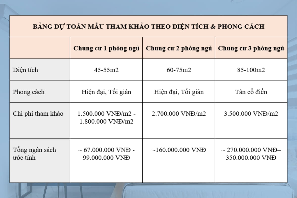 Nếu bạn đang băn khoăn không biết nên chuẩn bị ngân sách bao nhiêu cho căn hộ của mình, thì bảng dự toán mẫu dưới đây sẽ là gợi ý hữu ích. Dựa theo từng diện tích và phong cách thiết kế khác nhau, bảng này giúp bạn dễ dàng hình dung mức chi phí dự kiến, từ đó lên kế hoạch đầu tư hợp lý và chủ động hơn khi làm việc với đơn vị thi công.