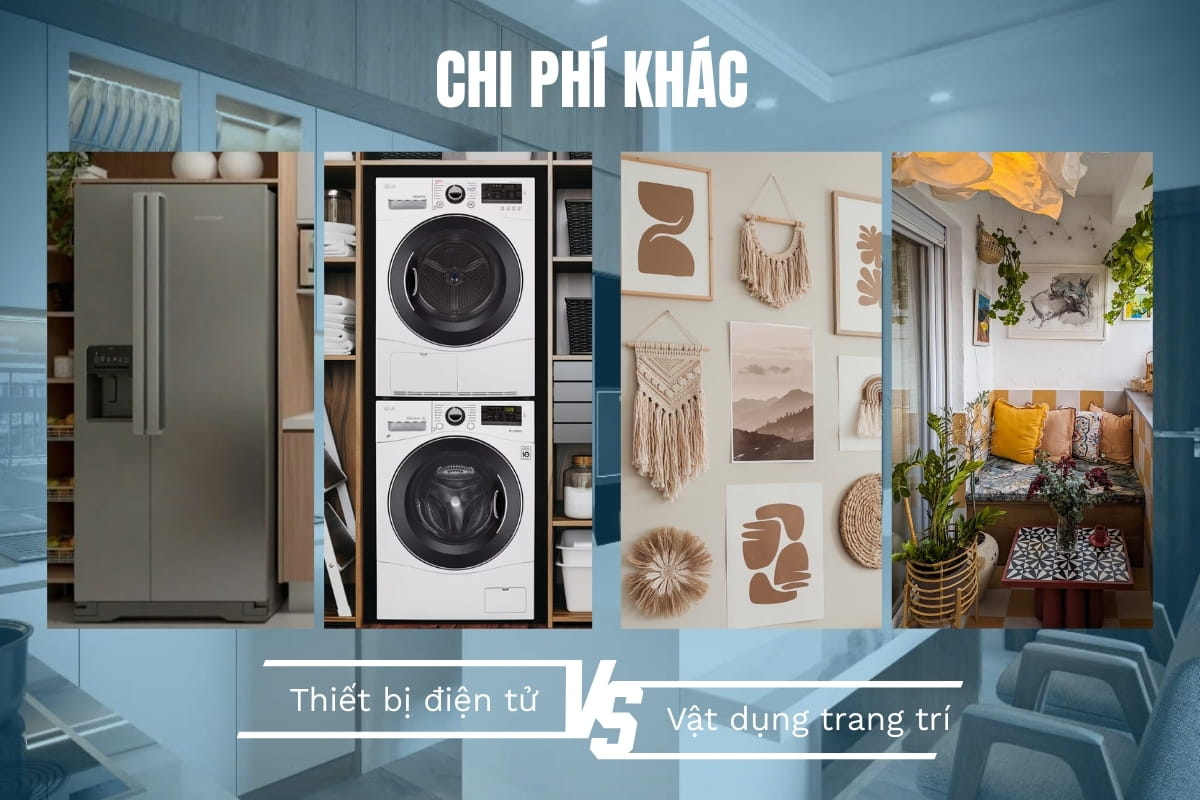 Ngoài các hạng mục chính, bạn cũng cần tính đến các chi phí khác như: thiết bị điện tử (máy lạnh, máy giặt, tủ lạnh…), vật dụng trang trí như rèm, tranh, đèn, cây xanh… Bên cạnh đó, đừng quên dành ra một khoản chi phí dự phòng để xử lý những phát sinh ngoài kế hoạch trong quá trình thi công và hoàn thiện nội thất.