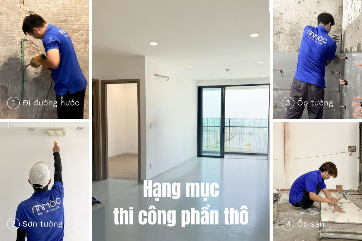 Tùy vào tình trạng thực tế của căn hộ, việc thi công phần thô có thể không cần thiết. Các hạng mục thi công phần thô thường gặp bao gồm: làm trần thạch cao, lát sàn, lắp đặt lại hệ thống điện nước, sơn tường và xử lý bề mặt.