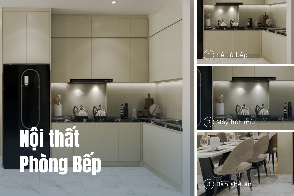 Phòng bếp là khu vực quan trọng cần đầu tư cả về công năng và thẩm mỹ. Một số hạng mục chính: Tủ bếp trên – dưới (gỗ công nghiệp, gỗ tự nhiên hoặc inox), mặt bếp (đá granite hoặc đá nhân tạo), thiết bị bếp: bếp từ, hút mùi, chậu rửa …, bàn ăn và ghế