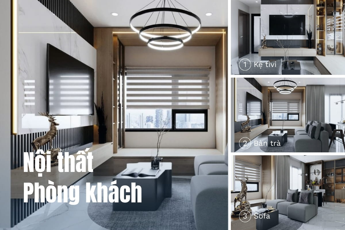 Không gian sinh hoạt chung này thường bao gồm: Sofa (ghế băng, sofa góc hoặc sofa đơn), bàn trà, kệ tivi hoặc tủ trang trí, thảm, rèm cửa (nếu có)