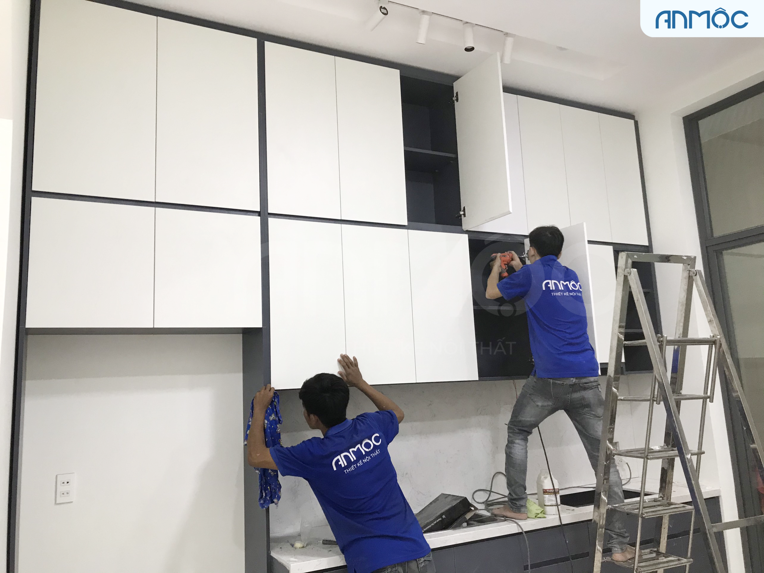 Thợ An Mộc đang thi công lắp đặt tủ bếp cho nhà bếp.Hệ tủ treo màu trắng kích thước khá lớn để bảo quản đồ đạc hiệu quả. Trong quá trình thi công, thợ An Mộc sẽ kết hợp vệ sinh sau khi lắp đặt hoàn thiện, giúp gia chủ tiết kiệm thời gian và chi phí để dọn dẹp.
