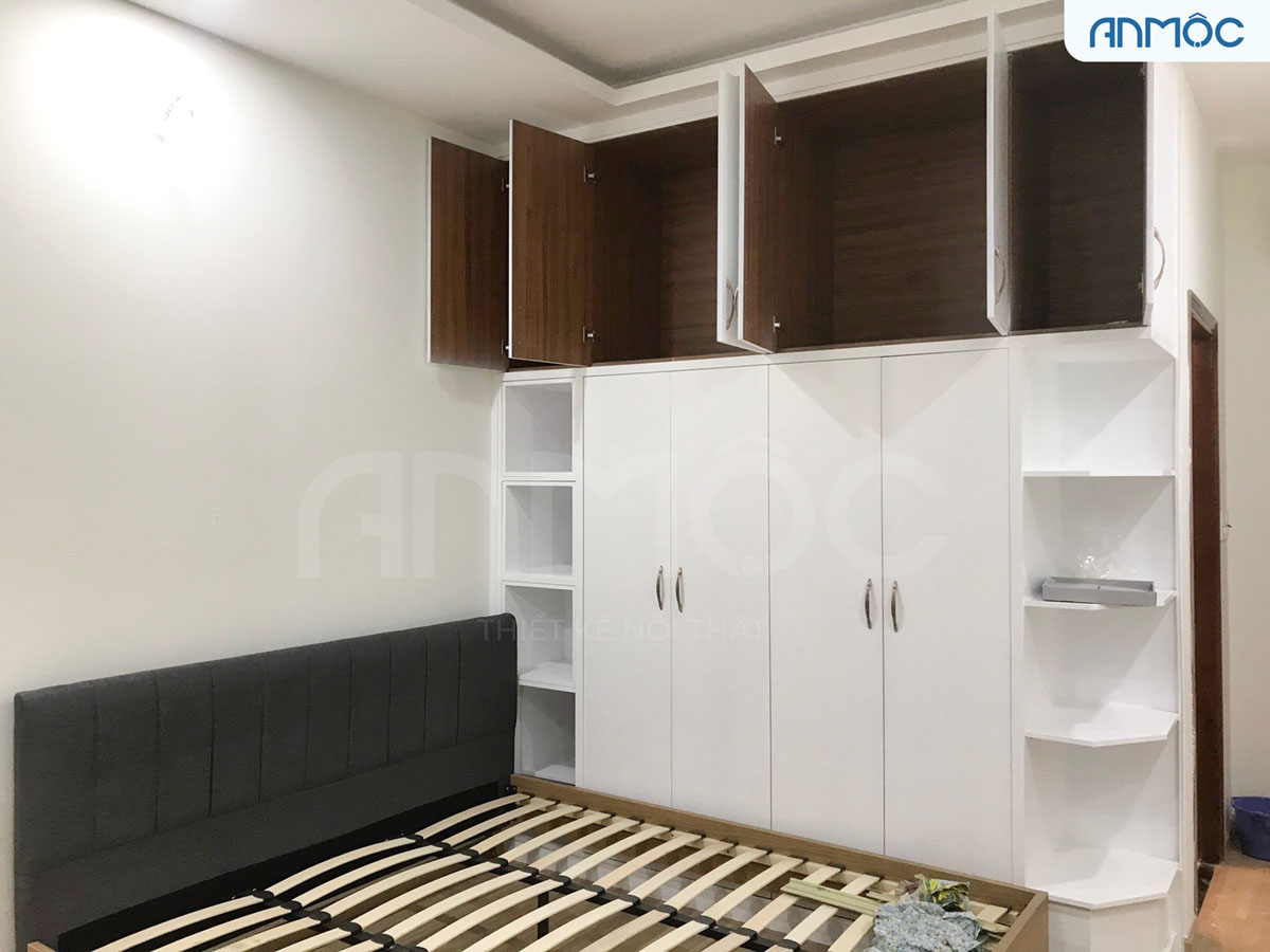 Thiết kế tủ quần áo nhiều ngăn, phối với với kệ mở giúp gia chủ tiện dụng hơn khi sử dụng.