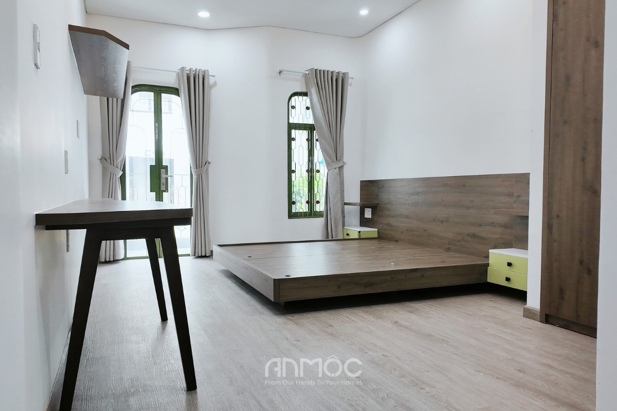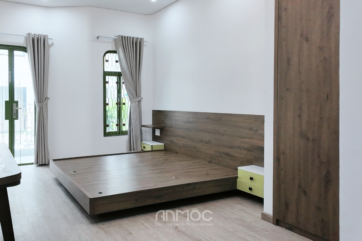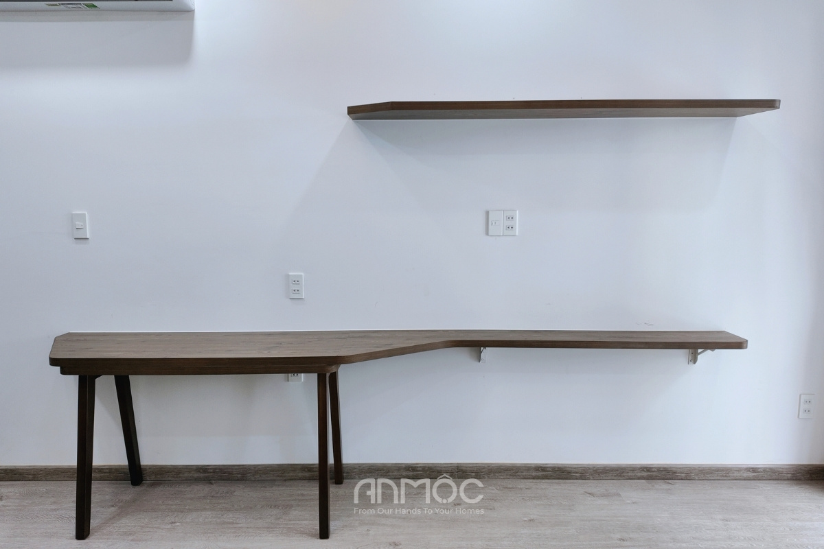Không gian được sắp xếp tinh gọn với các nội thất cơ bản, sử dụng gỗ MDF phối màu hài hòa, vừa đảm bảo thẩm mỹ vừa tối ưu chi phí cho nhà đầu tư. Quá trình thi công được An Mộc thực hiện chuẩn chỉnh, không chỉ đảm bảo giống với bản vẽ 3D mà còn sắc nét, chất lượng.