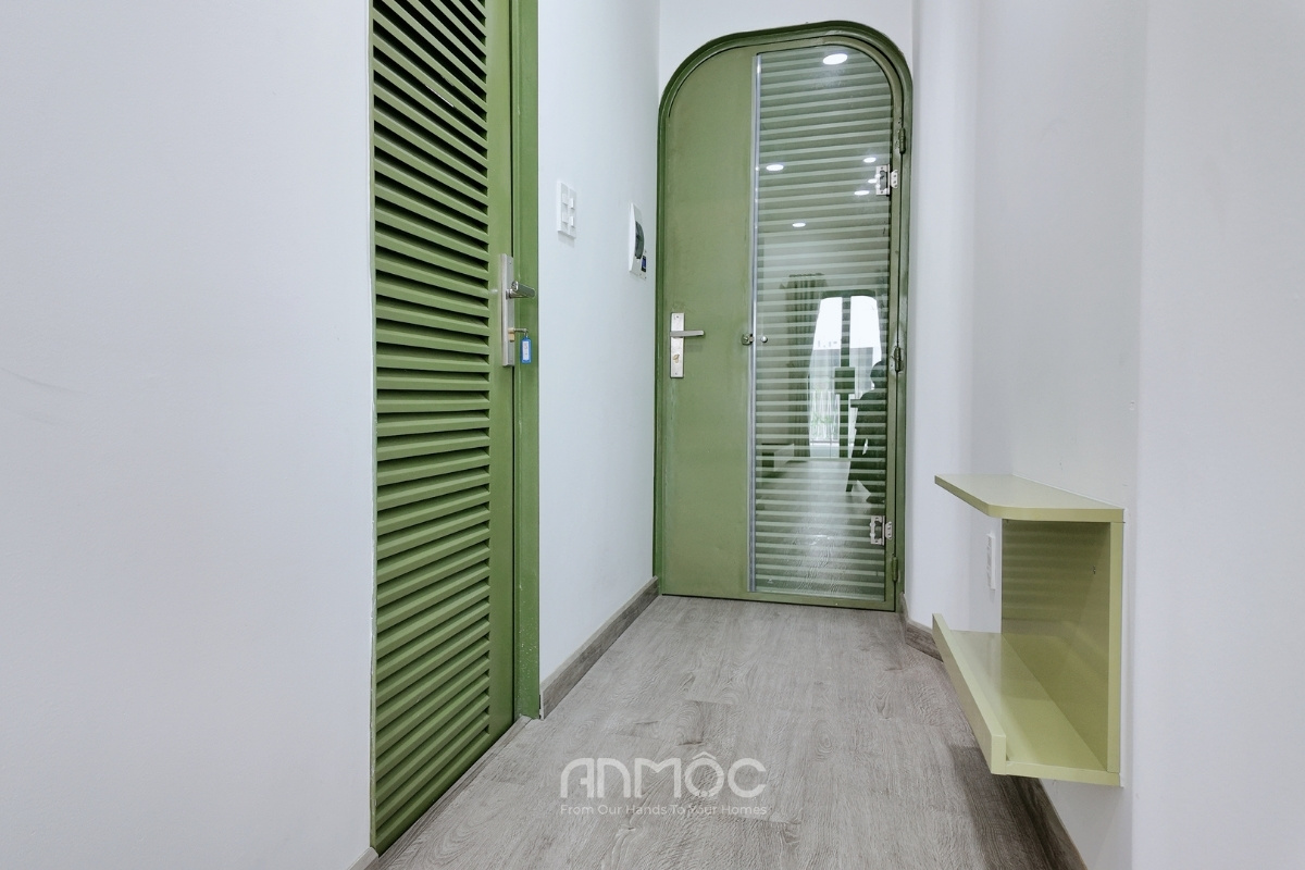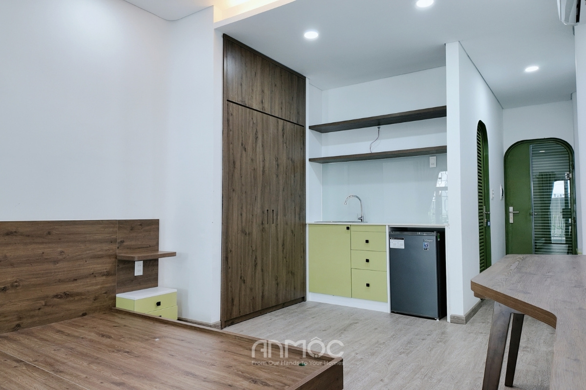 Hệ tủ quần áo kịch trần thiết kế cánh trượt âm tường giúp tăng tối đa khả năng lưu trữ, phù hợp với nhu cầu sử dụng thực tế của khách thuê. Bên cạnh là khu bếp được bố trí gọn sát tường, thiết kế đơn giản nhưng đủ dùng với chậu rửa, tủ dưới và kệ phía trên. Tông xanh kết hợp vân gỗ giúp không gian bếp nhìn sạch sẽ, dễ chịu, phù hợp với mô hình phòng cho thuê – tiện lợi, gọn gàng và dễ bảo trì.