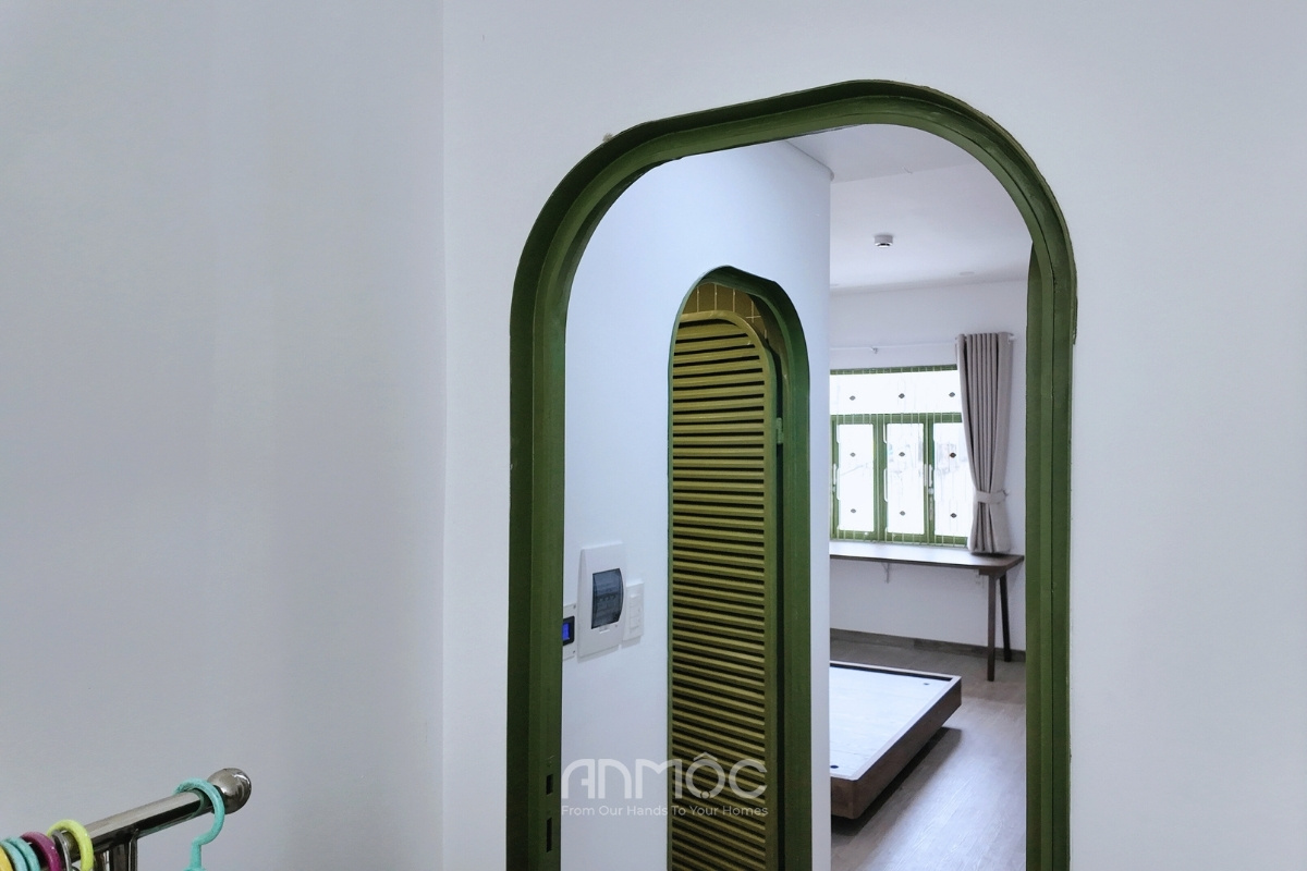 Giường bục kết hợp tab đầu giường giúp tối ưu diện tích, đồng thời tạo cảm giác liền mạch cho tổng thể. Khu bếp nhỏ được đặt sát tường, sử dụng tủ dưới màu xanh phối cùng vân gỗ, vừa đủ dùng mà vẫn giữ được sự gọn gàng. Đối diện với giường ngủ là khu vực kệ TV được thiết kế treo tinh giản, vừa đủ sử dụng. Toàn bộ căn phòng trở nên thoáng và dễ chịu hơn nhờ hệ cửa sổ lớn, đón ánh sáng tự nhiên tốt, giúp không gian luôn sáng và có cảm giác rộng rãi hơn thực tế.