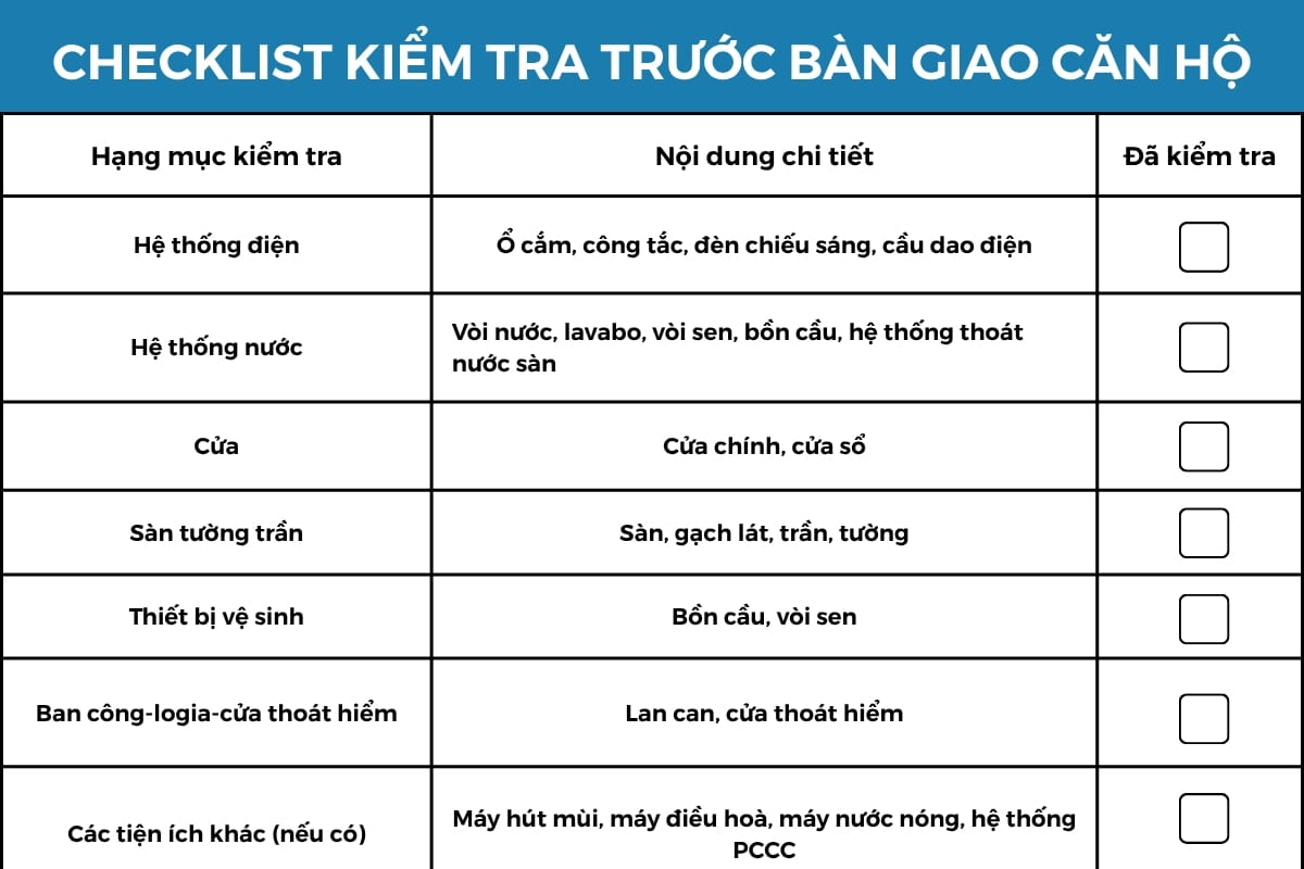 Khi nhận bàn giao, bạn nên mang theo một checklist kiểm tra chất lượng căn hộ để đảm bảo không bỏ sót chi tiết nào. Ưu tiên kiểm tra các hạng mục quan trọng như: hệ thống điện – nước có hoạt động ổn định không, thiết bị vệ sinh có rò rỉ, cửa ra vào và cửa sổ đóng mở chắc chắn, trần tường có nứt hoặc ẩm mốc không. Nếu không tự tin, bạn có thể thuê dịch vụ kiểm tra độc lập để đánh giá kỹ hơn.