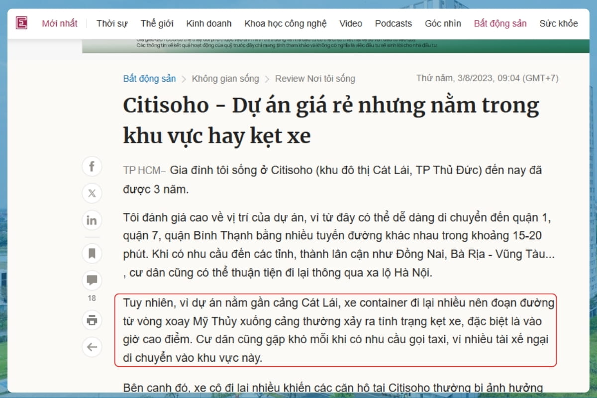 Dự án Citisoho nằm trong khu đô thị Cát Lái, quận 2 (nay là TP. Thủ Đức), được chào bán với mức giá hấp dẫn và đầy đủ tiện ích nội khu như hồ bơi, phòng tập gym, siêu thị. Tuy nhiên, vị trí của dự án lại nằm trong khu vực thường xuyên xảy ra ùn tắc giao thông, đặc biệt là tại nút giao Mỹ Thủy, gây khó khăn cho cư dân trong việc di chuyển hàng ngày. Điều này ảnh hưởng không nhỏ đến chất lượng cuộc sống và giá trị bất động sản của dự án.