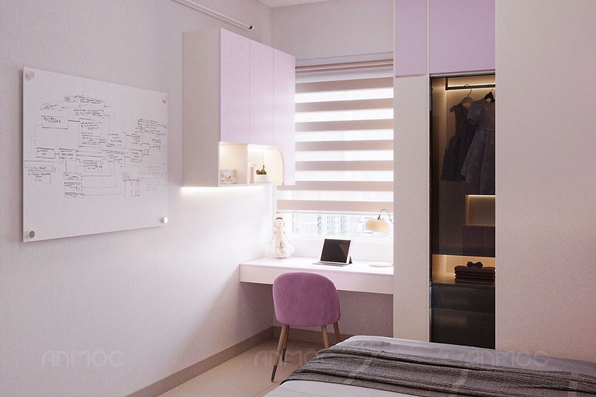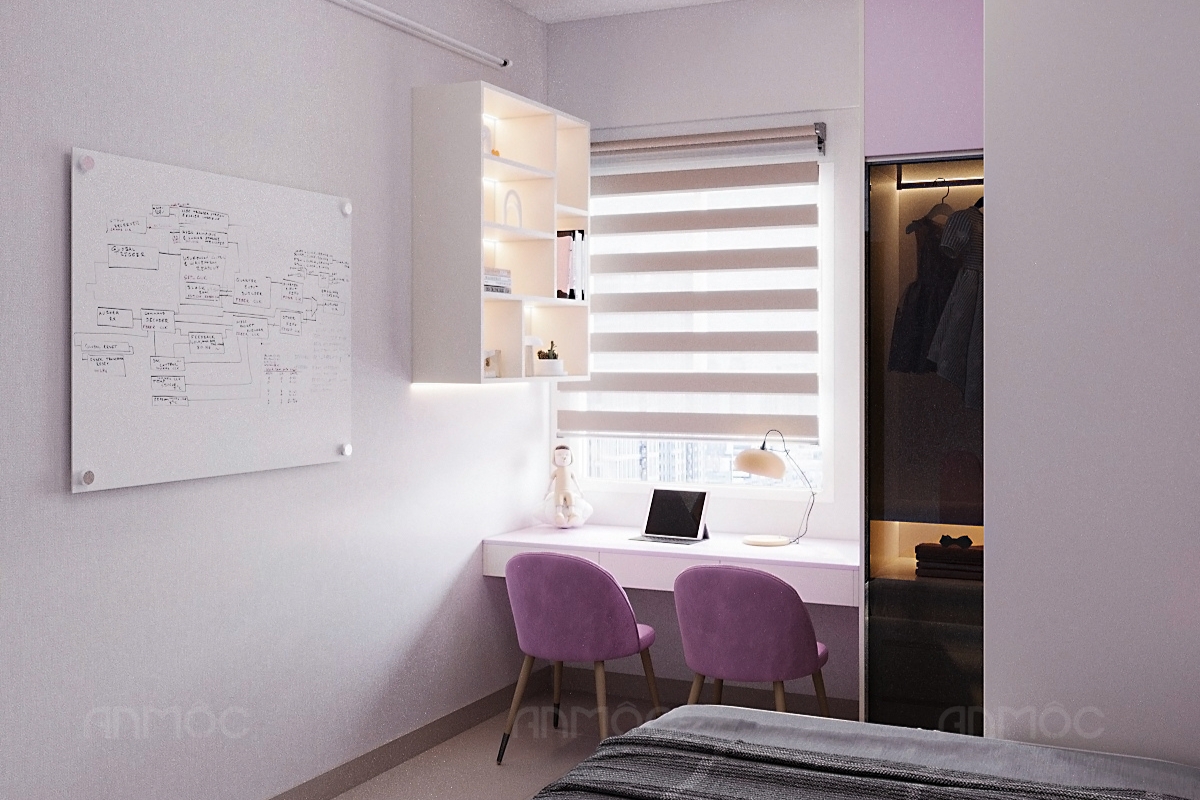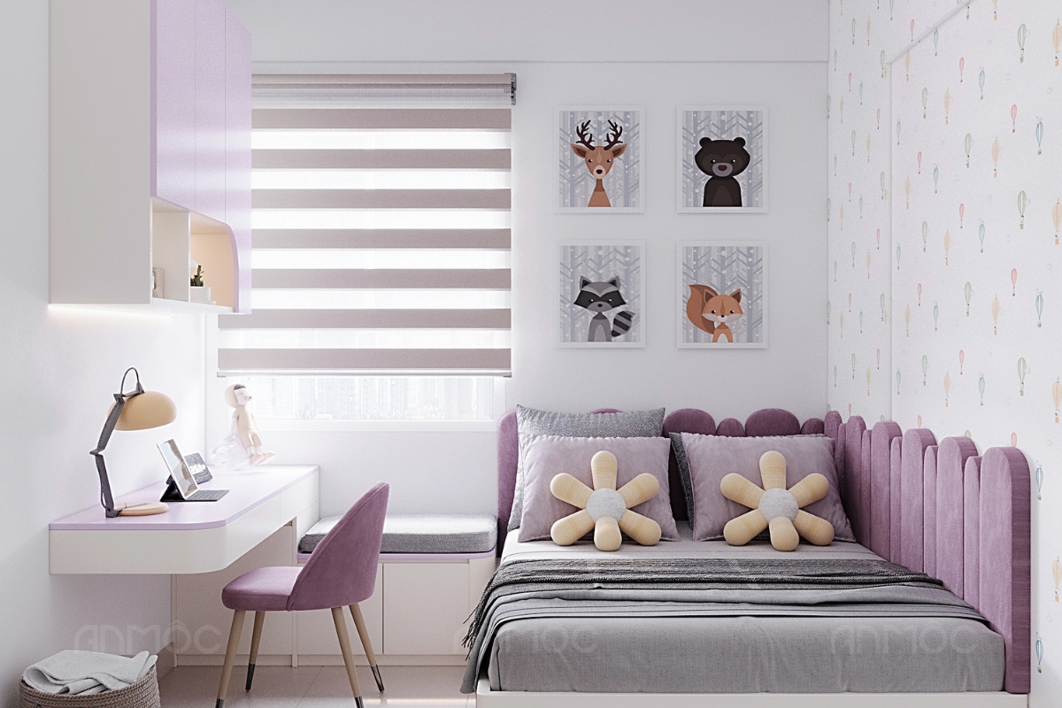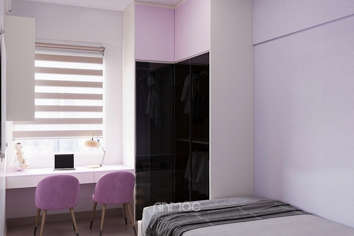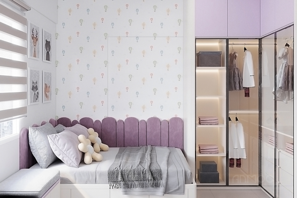 Dựa trên nhu cầu của gia chủ và bé, KTS An Mộc đã lựa chọn bảng moodboard phối màu gồm các gam tím pastel, tím trầm kết hợp xám và trắng, không gian được định hình nhẹ nhàng, hài hòa và tạo cảm giác thư giãn. Màu tím pastel mang đến sự tươi mới, dễ thương phù hợp với bé gái, trong khi sắc xám và trắng trung tính giúp cân bằng, tránh cảm giác rực rỡ quá mức.