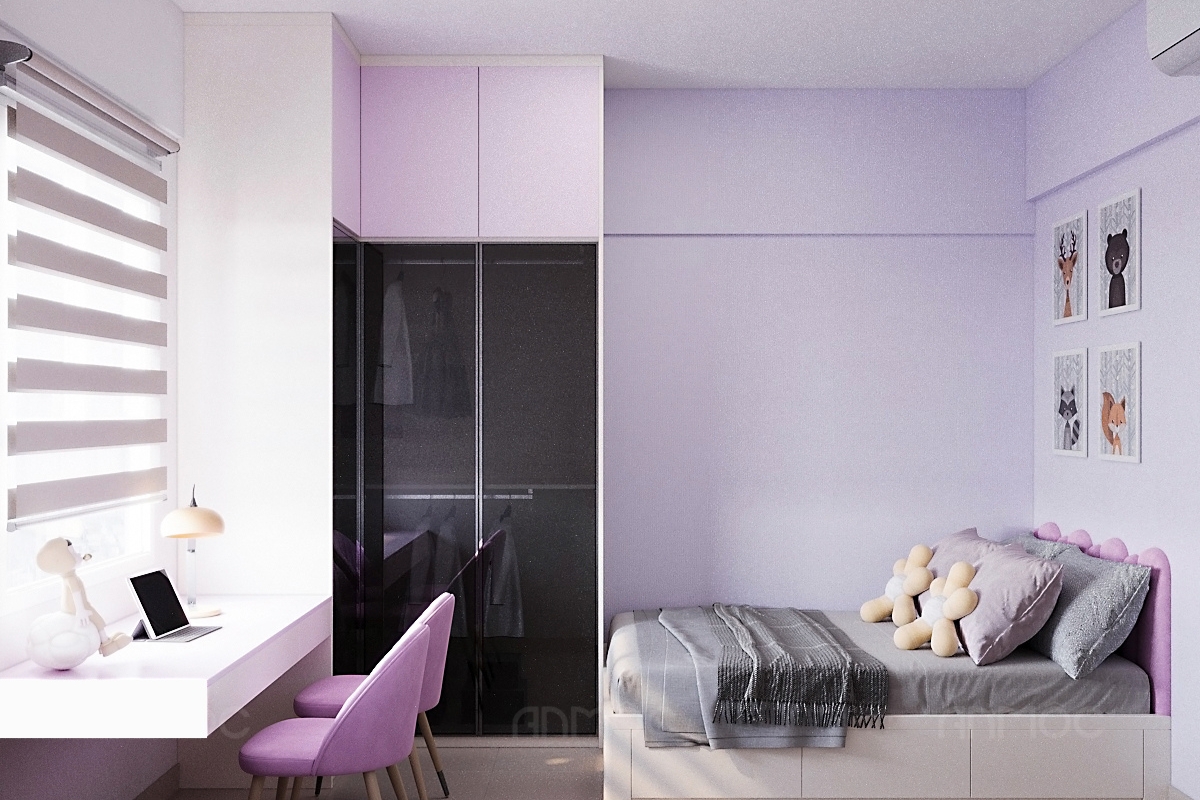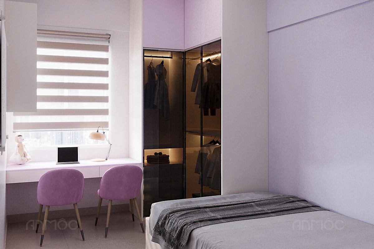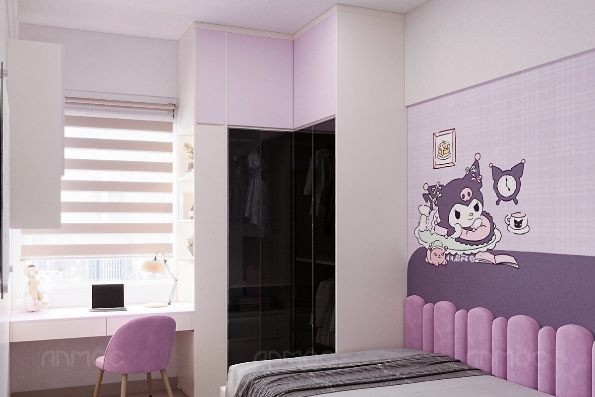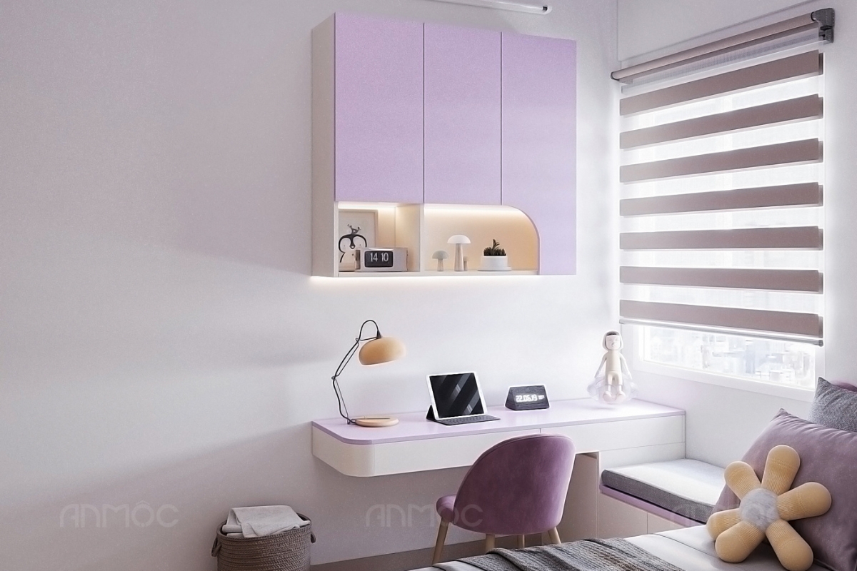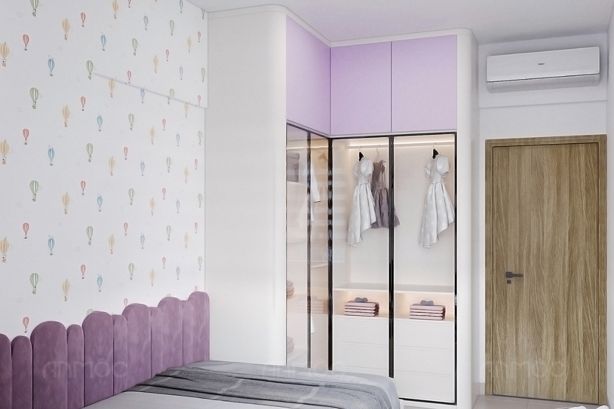 Dựa trên nhu cầu của gia chủ và bé, KTS An Mộc đã lựa chọn bảng moodboard phối màu gồm các gam tím pastel, tím trầm kết hợp xám và trắng, không gian được định hình nhẹ nhàng, hài hòa và tạo cảm giác thư giãn. Màu tím pastel mang đến sự tươi mới, dễ thương phù hợp với bé gái, trong khi sắc xám và trắng trung tính giúp cân bằng, tránh cảm giác rực rỡ quá mức.