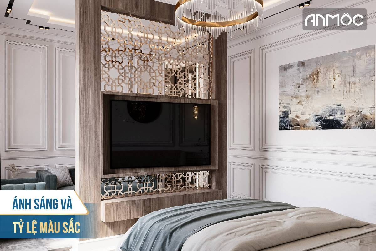 Trong phong cách tân cổ điển, hệ thống chiếu sáng đóng vai trò quan trọng trong việc tôn lên vẻ đẹp tinh tế của không gian. Bên cạnh ánh sáng nhân tạo từ đèn chùm, đèn tường thì việc tận dụng nguồn ánh sáng tự nhiên cũng là yếu tố cần thiết.