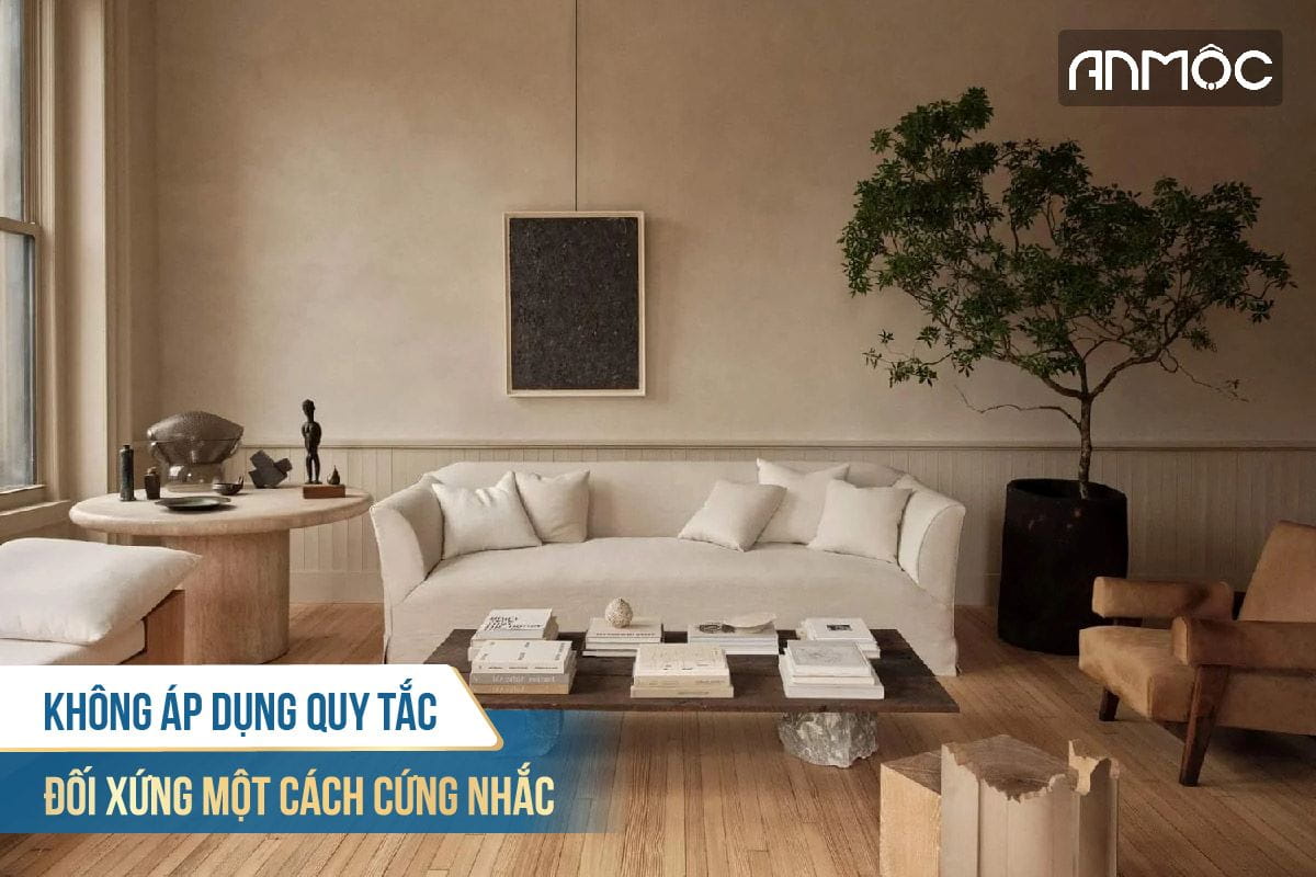 Đây là một đặc điểm quan trọng của phong cách Wabi Sabi, nơi tính tự nhiên và sự bất đối xứng được đề cao. Phong cách này khuyến khích sự linh hoạt và sáng tạo trong việc sắp xếp nội thất, giúp tạo ra không gian tự do, không bị gò bó theo các quy tắc đối xứng nghiêm ngặt.