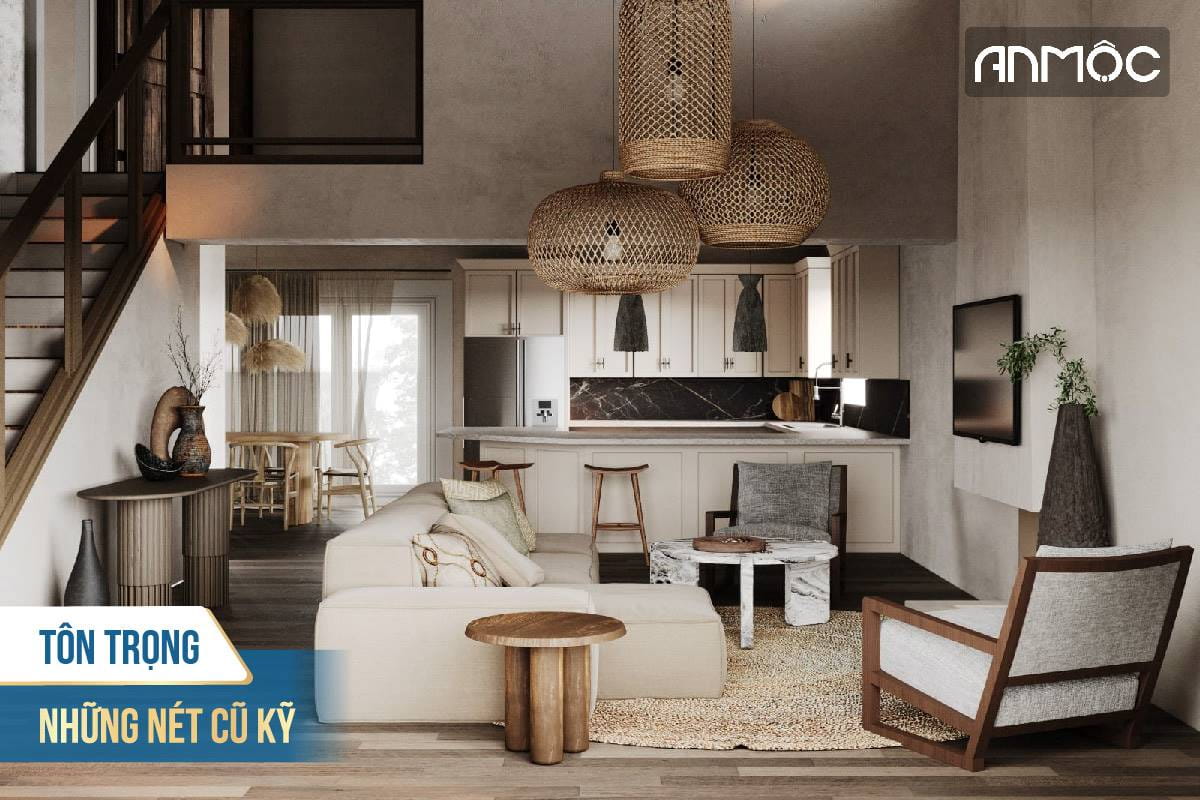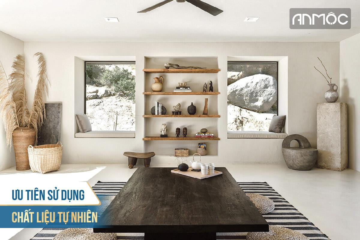 - Sử dụng vật liệu tự nhiên: Đảm bảo rằng vật liệu như gỗ, đá, đất sét và vải thô được sử dụng để kết nối không gian với thiên nhiên, tạo cảm giác ấm cúng và thư giãn, đồng thời giữ sự thô mộc, giản dị.