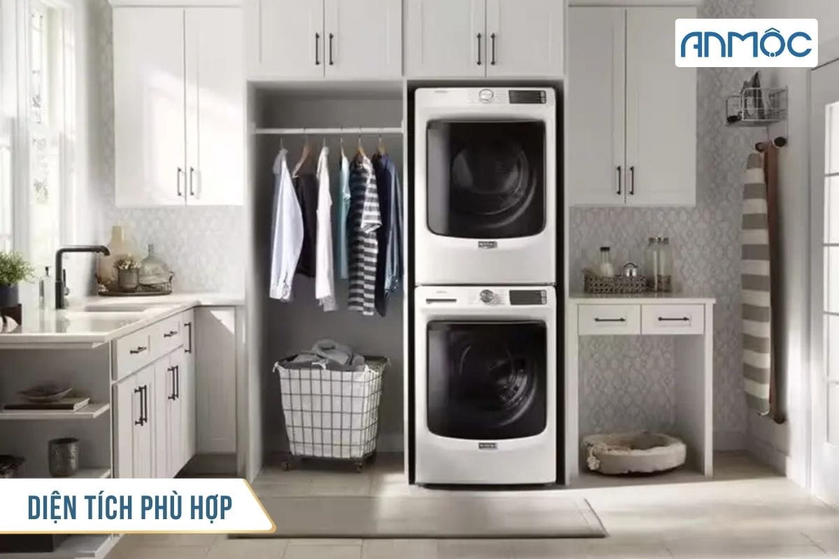 Đảm bảo phòng giặt có không gian thoải mái để bạn có thể dễ dàng di chuyển, đặt máy giặt, máy sấy, và các kệ hoặc tủ lưu trữ. Sắp xếp các thiết bị sao cho thuận tiện trong quá trình sử dụng mà không chiếm quá nhiều diện tích.