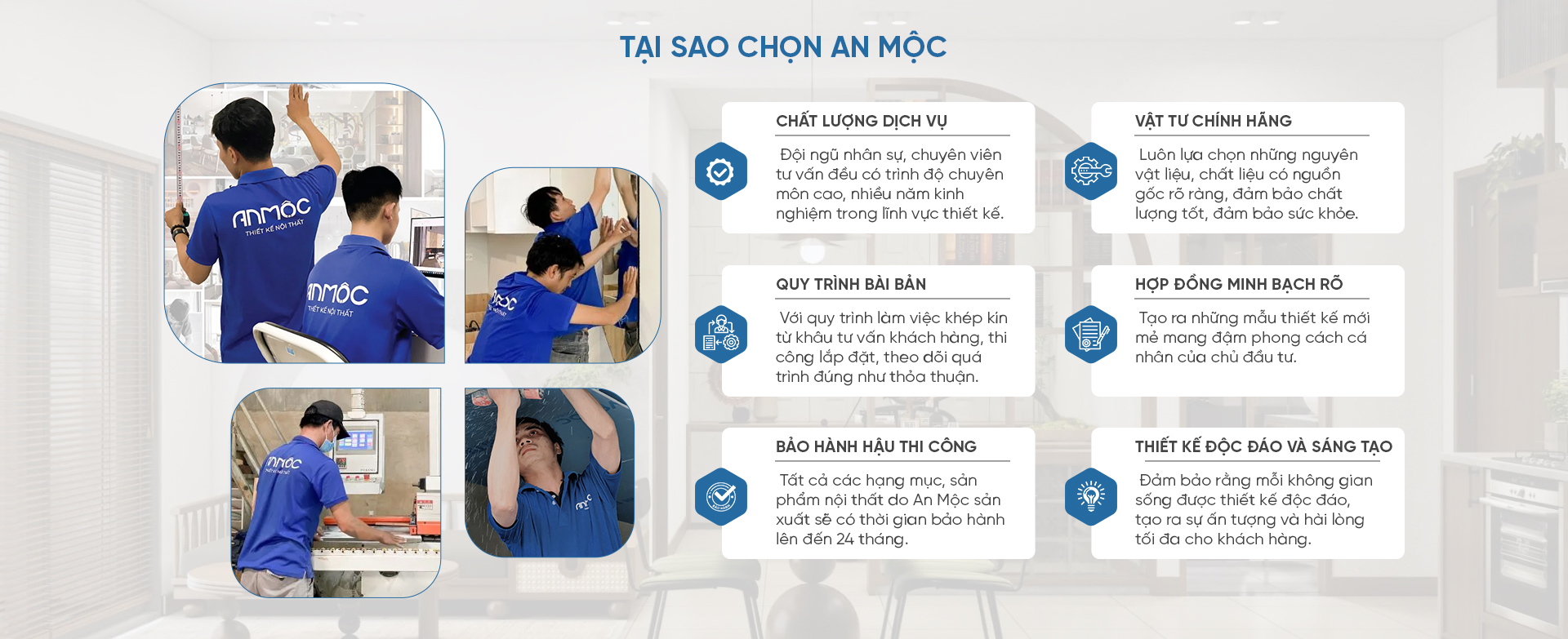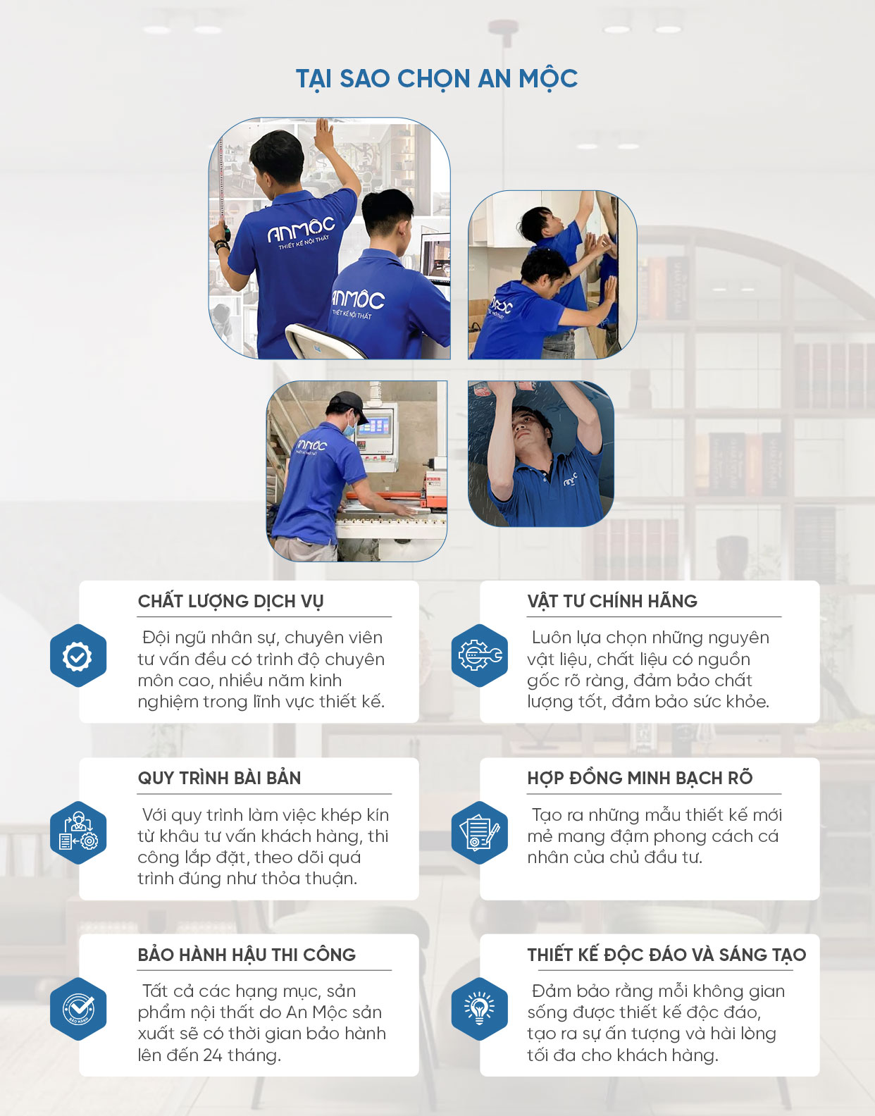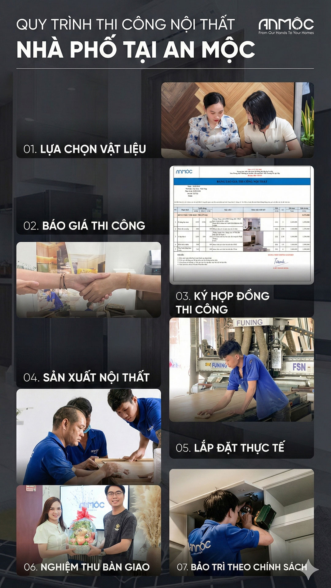 Quy trình thi công của chúng tôi được xây dựng dựa trên sự chuyên nghiệp, sự tỉ mỉ và chính xác đến từng chi tiết. Từ việc tư vấn thiết kế nội thất, báo giá thi công đến sản xuất và lắp đặt, luôn được thực hiện một cách chuyên nghiệp và chỉn chu. An Mộc cam kết cung cấp dịch vụ tốt nhất, đảm bảo rằng mọi dự án được hoàn thành đúng tiến độ và vượt qua kỳ vọng của đối tác.