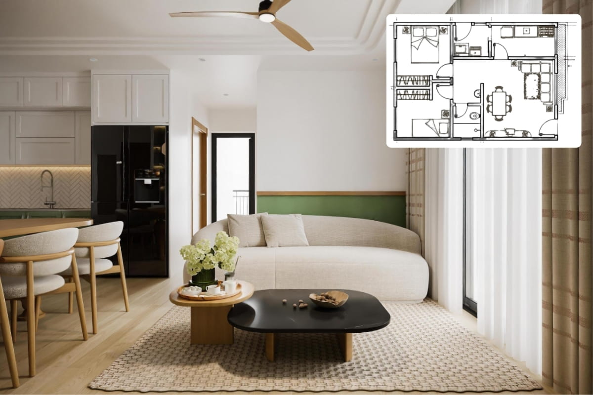 Với diện tích 55m² của căn hộ, bạn có thể bố trí phòng khách, bếp và 1-2 phòng ngủ, tuy nhiên để không gian thật sự thoải mái, việc bố trí cần được tính toán cẩn thận. Bởi nếu sắp xếp thiếu hợp lý, căn hộ rất dễ rơi vào tình trạng chật chội, bí bách và thiếu sự liên kết giữa các khu vực.