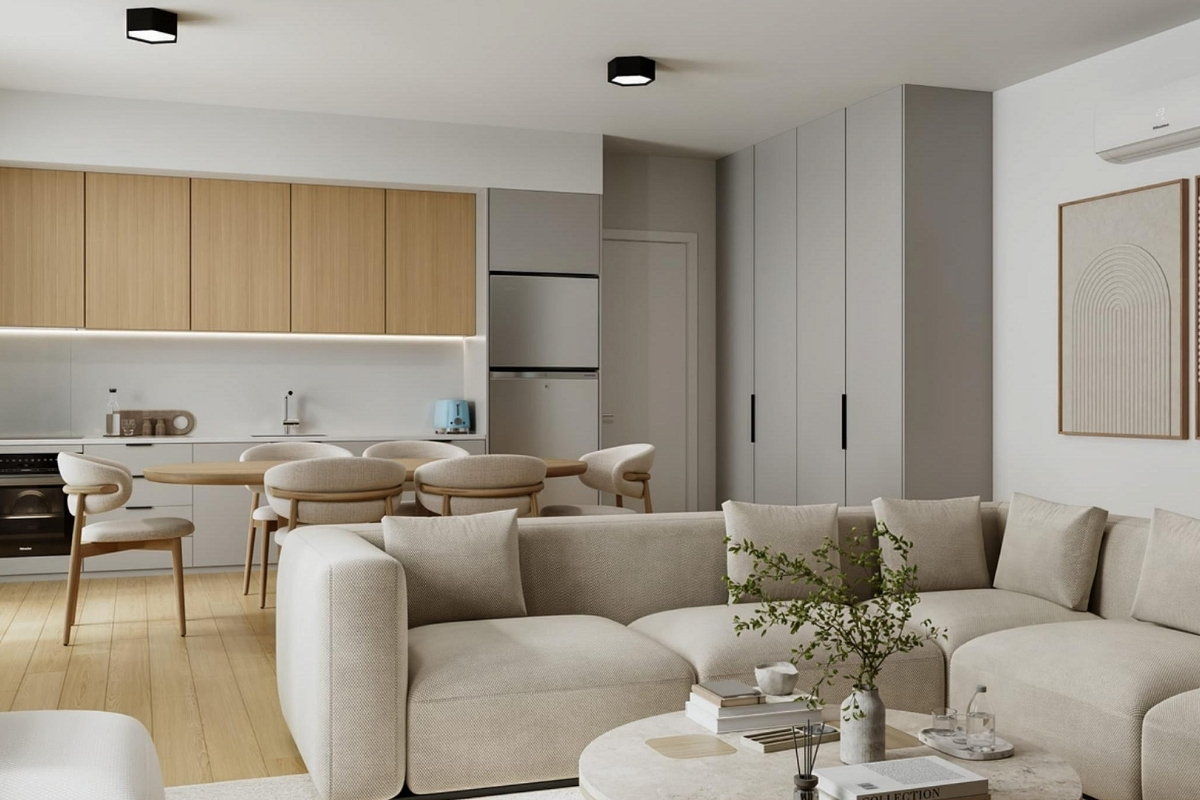 Phòng khách và bếp thường được thiết kế theo không gian mở để tạo cảm giác rộng rãi hơn. Các tông màu sáng như trắng, be hoặc màu gỗ tự nhiên kết hợp với ánh sáng hài hòa mang lại sự cân bằng giữa thẩm mỹ và công năng, phù hợp với gia đình trẻ hoặc người cần không gian linh hoạt.