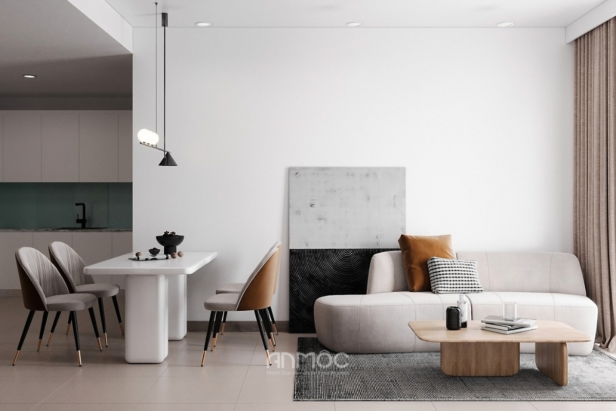 Trong thiết kế chung cư 60m2, việc lựa chọn màu sắc cũng phần nào ảnh hưởng lớn đến cảm giác không gian. Những gam màu sáng như trắng, be, xám nhạt giúp không gian trông rộng hơn, tạo cảm giác thông thoáng. Đồng thời, khi trang trí nội thất căn hộ chung cư 60m2, nên sử dụng các vật liệu như kính, nhựa acrylic hoặc gỗ sáng màu để tăng độ phản chiếu ánh sáng, giúp căn hộ thêm phần hiện đại và thoải mái.